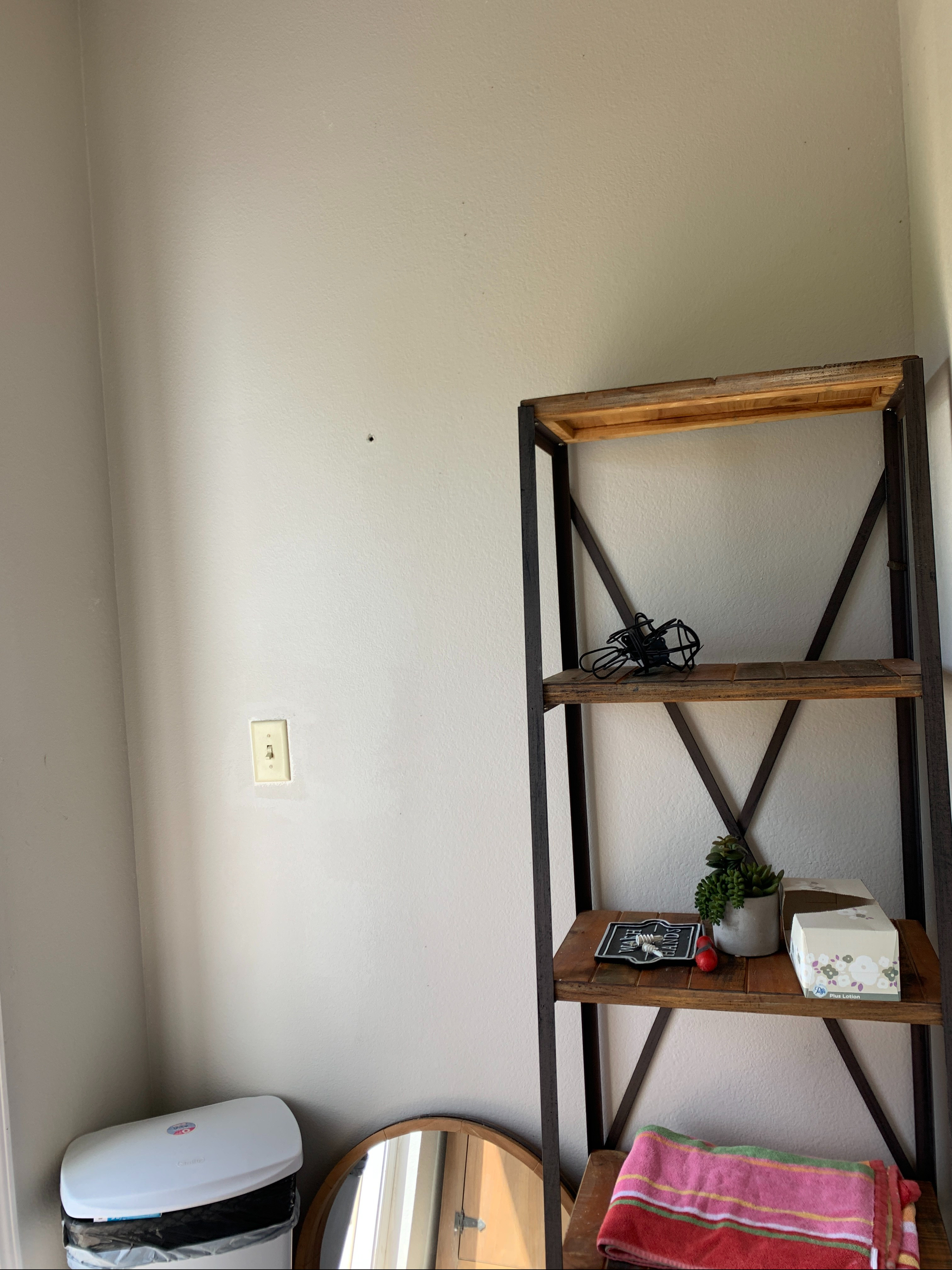 Our pool house has a bathroom, which is super convenient. I haven’t done much in there, however, apart from asking Ben to paint the walls last year. He has the shakiest hands ever, so I don’t let him cut in, because it would look like one of the kids did it. Well, a year came and went and I never got around to cutting in. With the upcoming wedding reception, however, I decided it was time to finally finish off this sad looking space. Except, instead of cutting in, I decided to do something totally different. And slightly more time consuming.