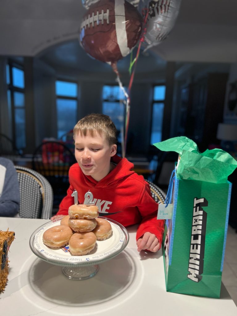 He opened one gift from Claire, ate his favorite glazed donuts for breakfast, and took more donuts to share with his class at school.