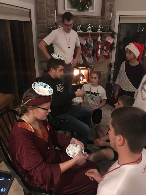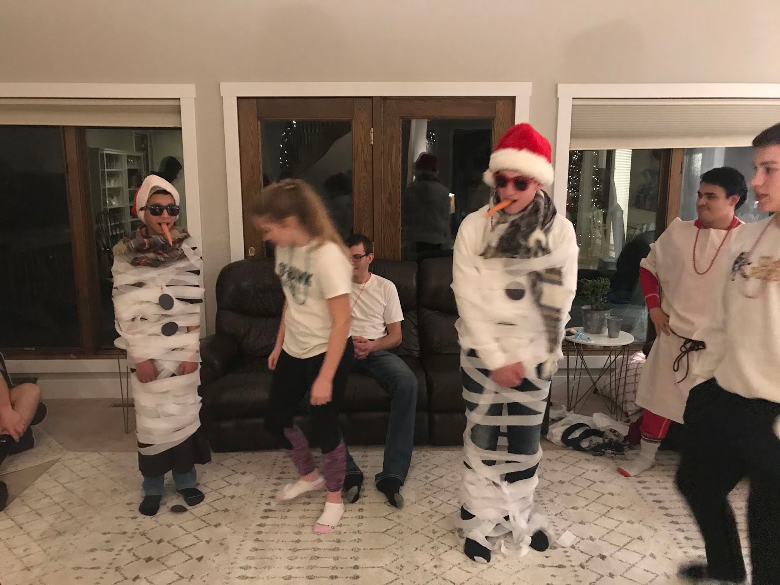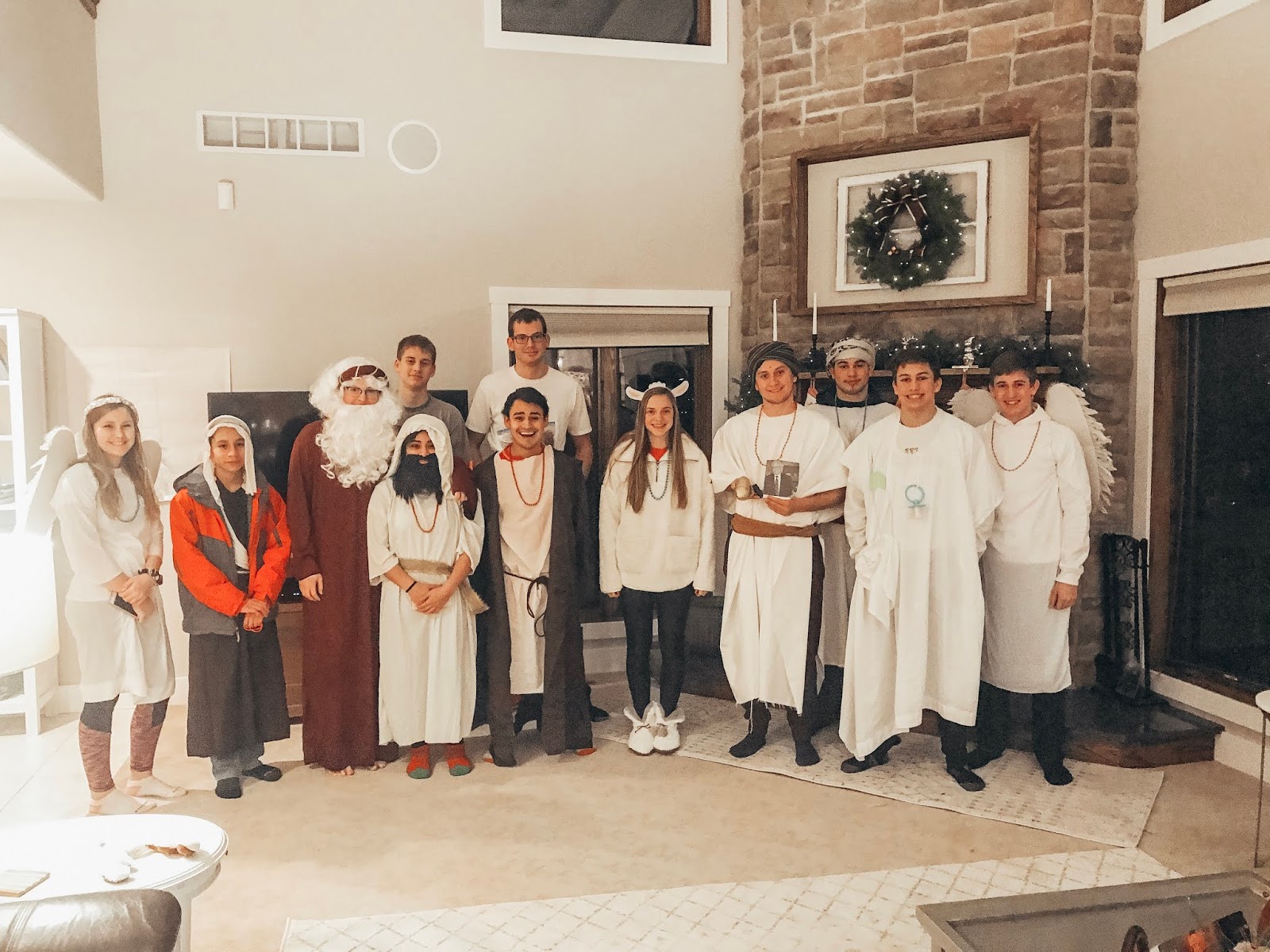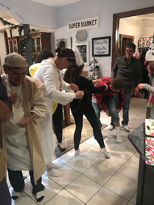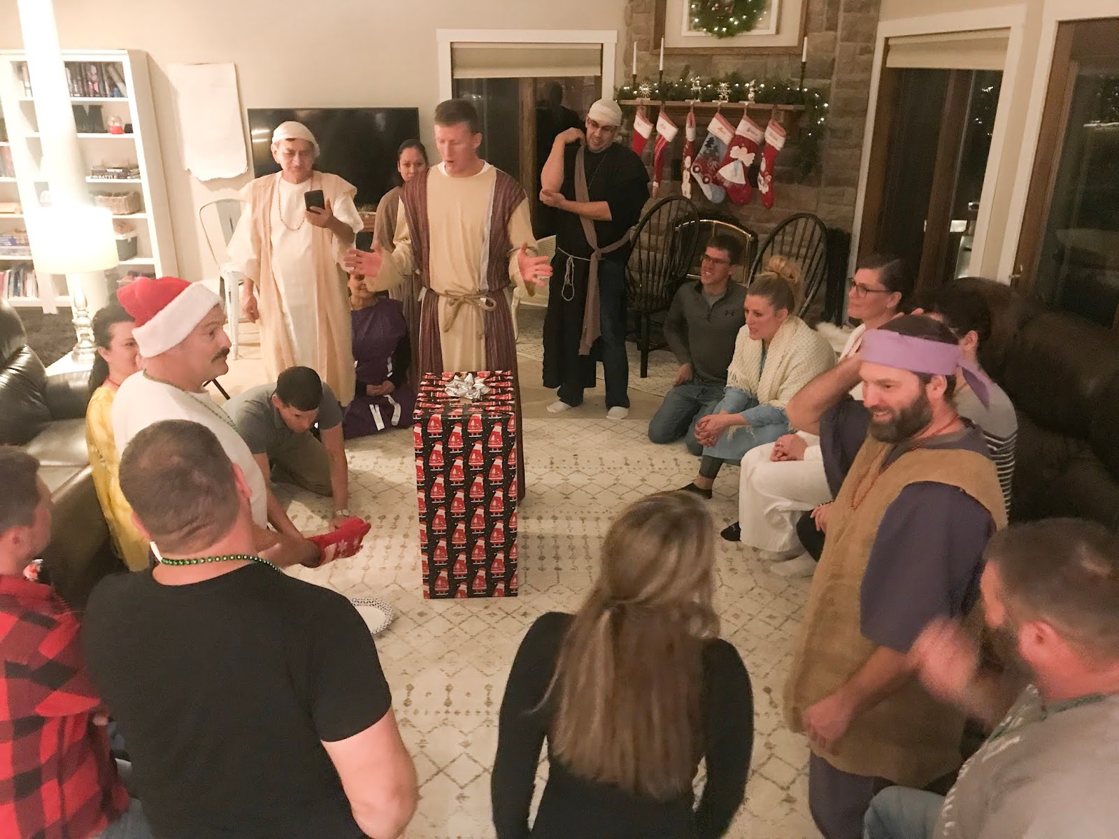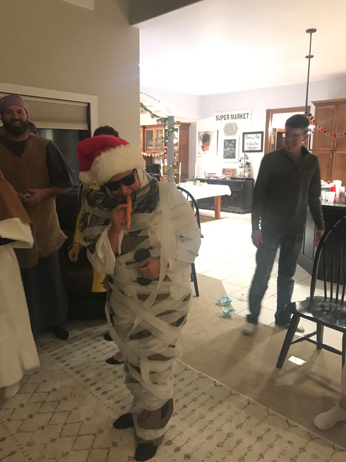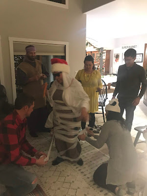 Party #2 with the “younger” people. Apparently three of them missed the memo to wear white. Wise Man Carson with his golden potato, frankincense oil, and picture of Mur{ray} was probably the favorite. Although Jack as baby Jesus and Clint as a manger were a close second. Actually, everyone did great with their costumes!