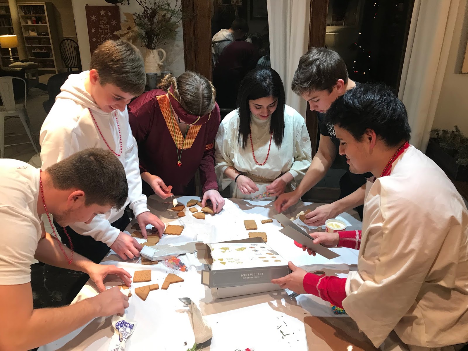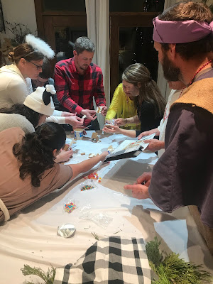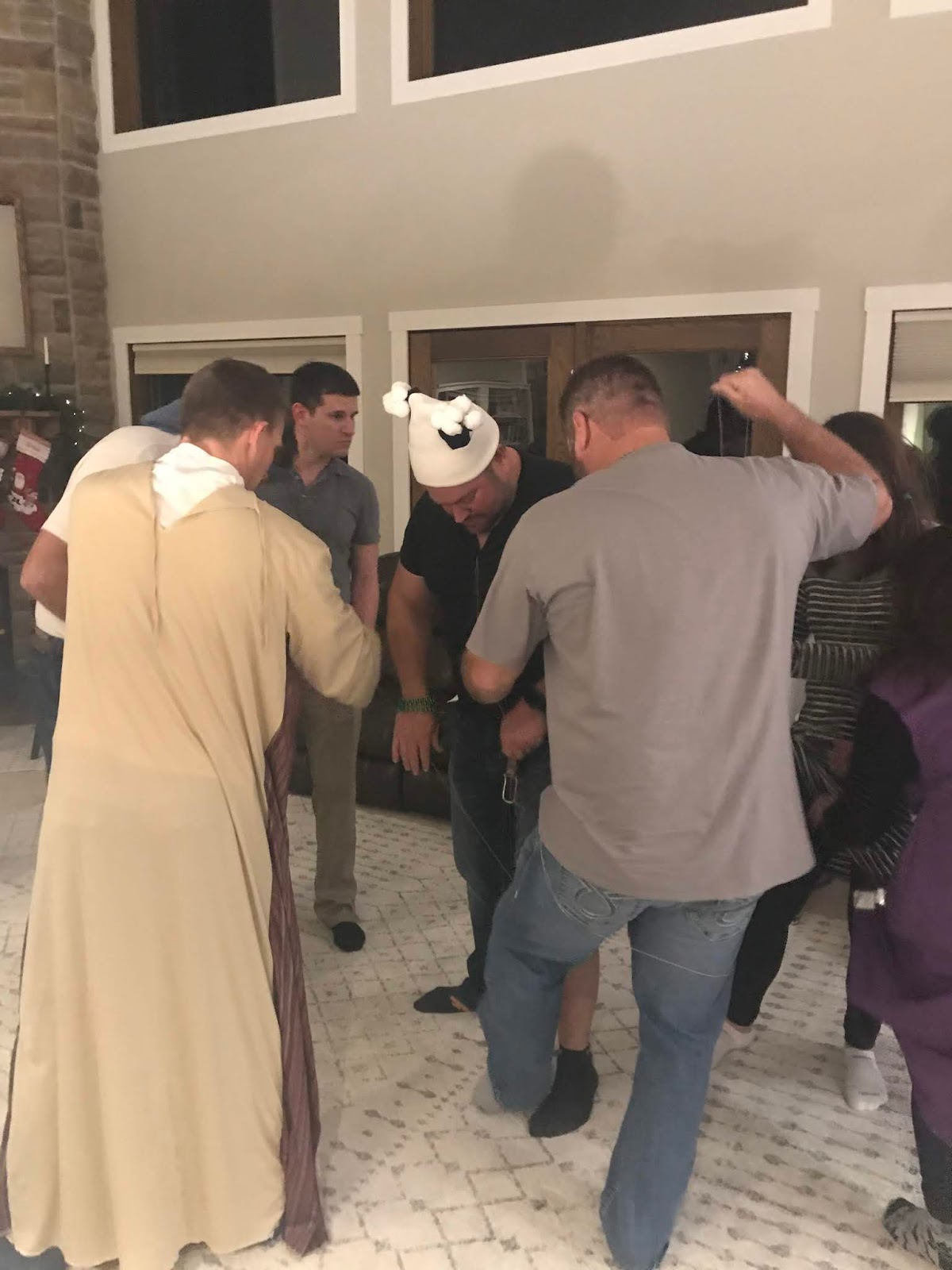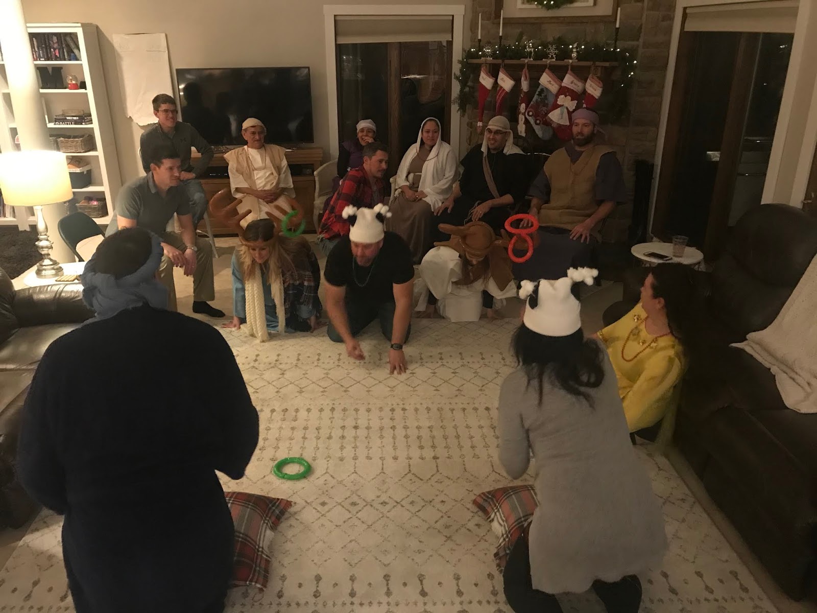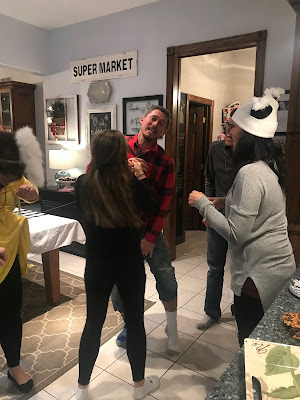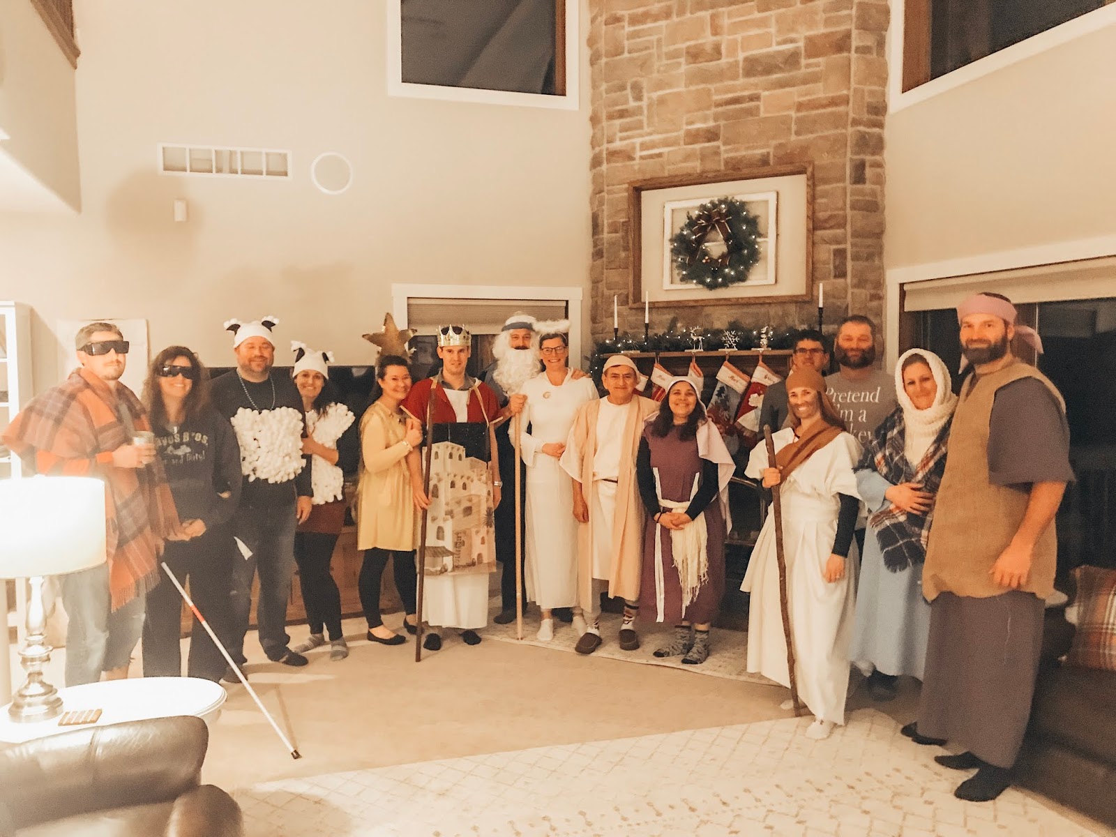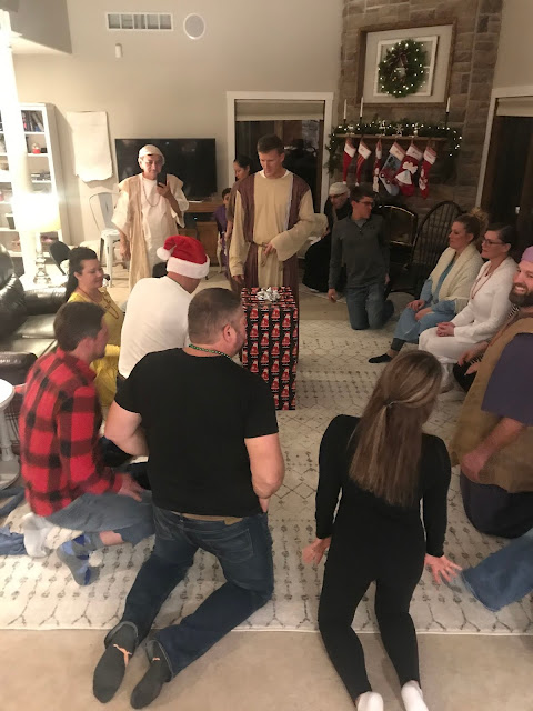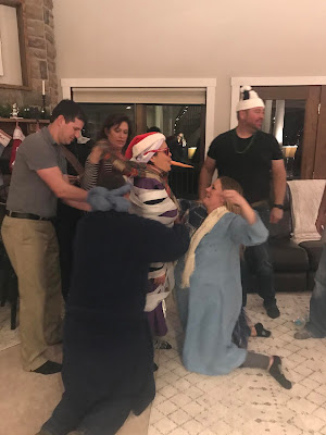 Party #2 with the “younger” people. Apparently three of them missed the memo to wear white. Wise Man Carson with his golden potato, frankincense oil, and picture of Mur{ray} was probably the favorite. Although Jack as baby Jesus and Clint as a manger were a close second. Actually, everyone did great with their costumes!