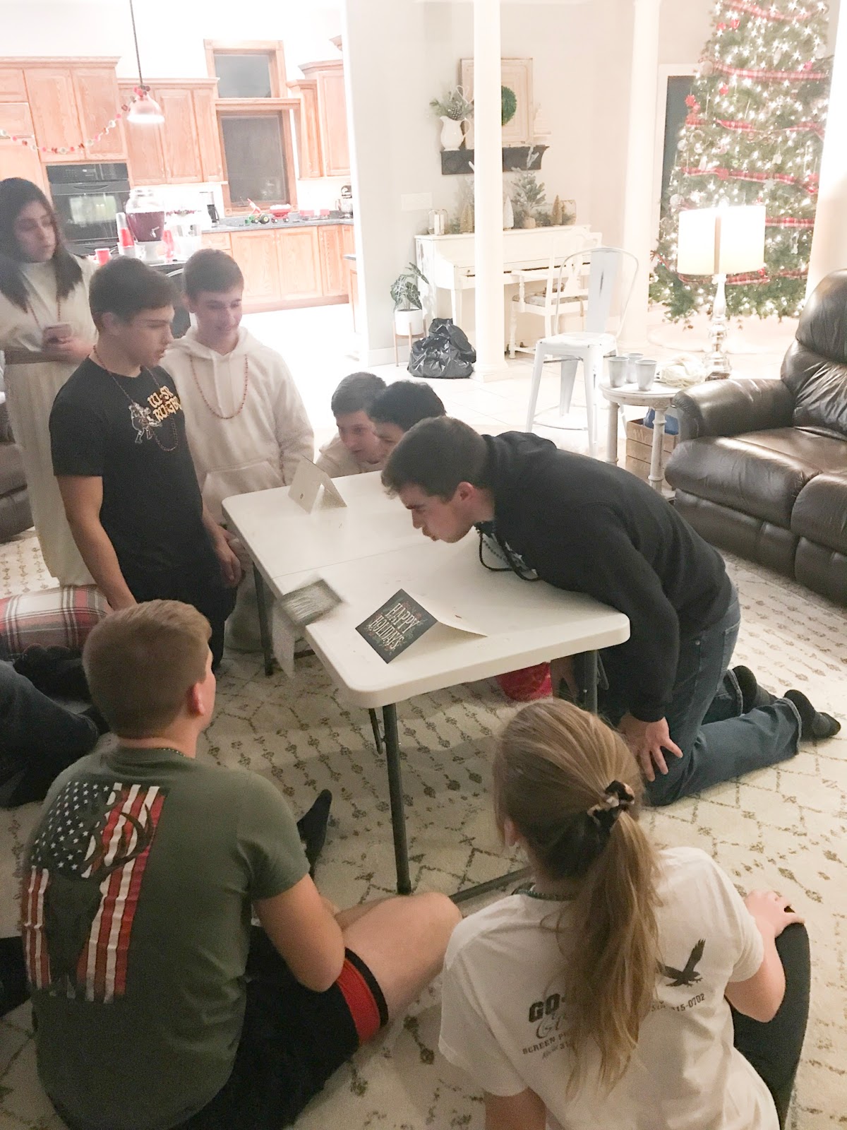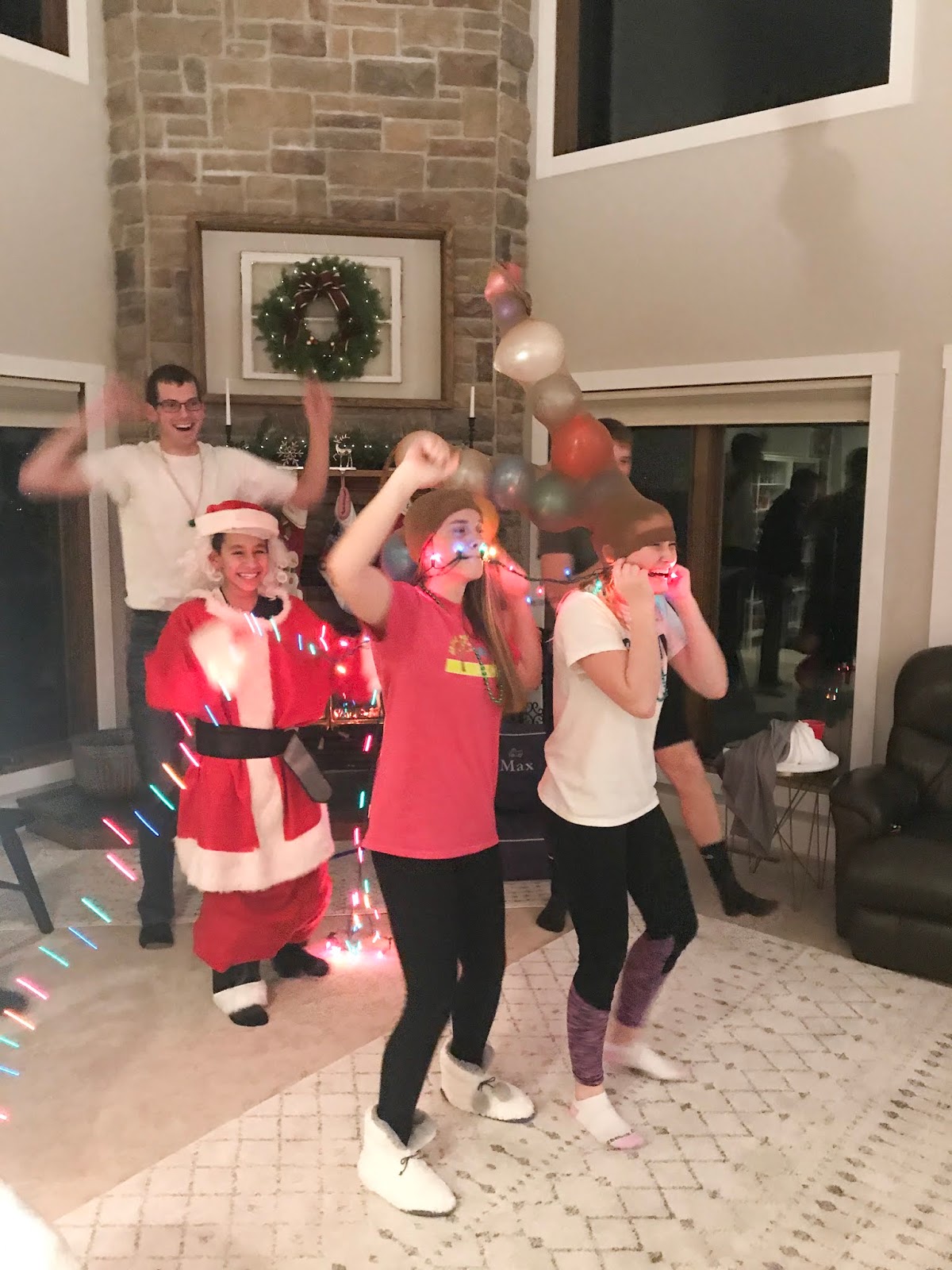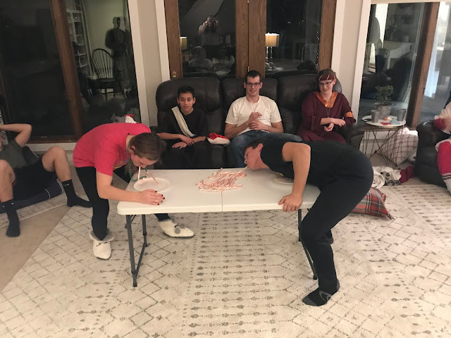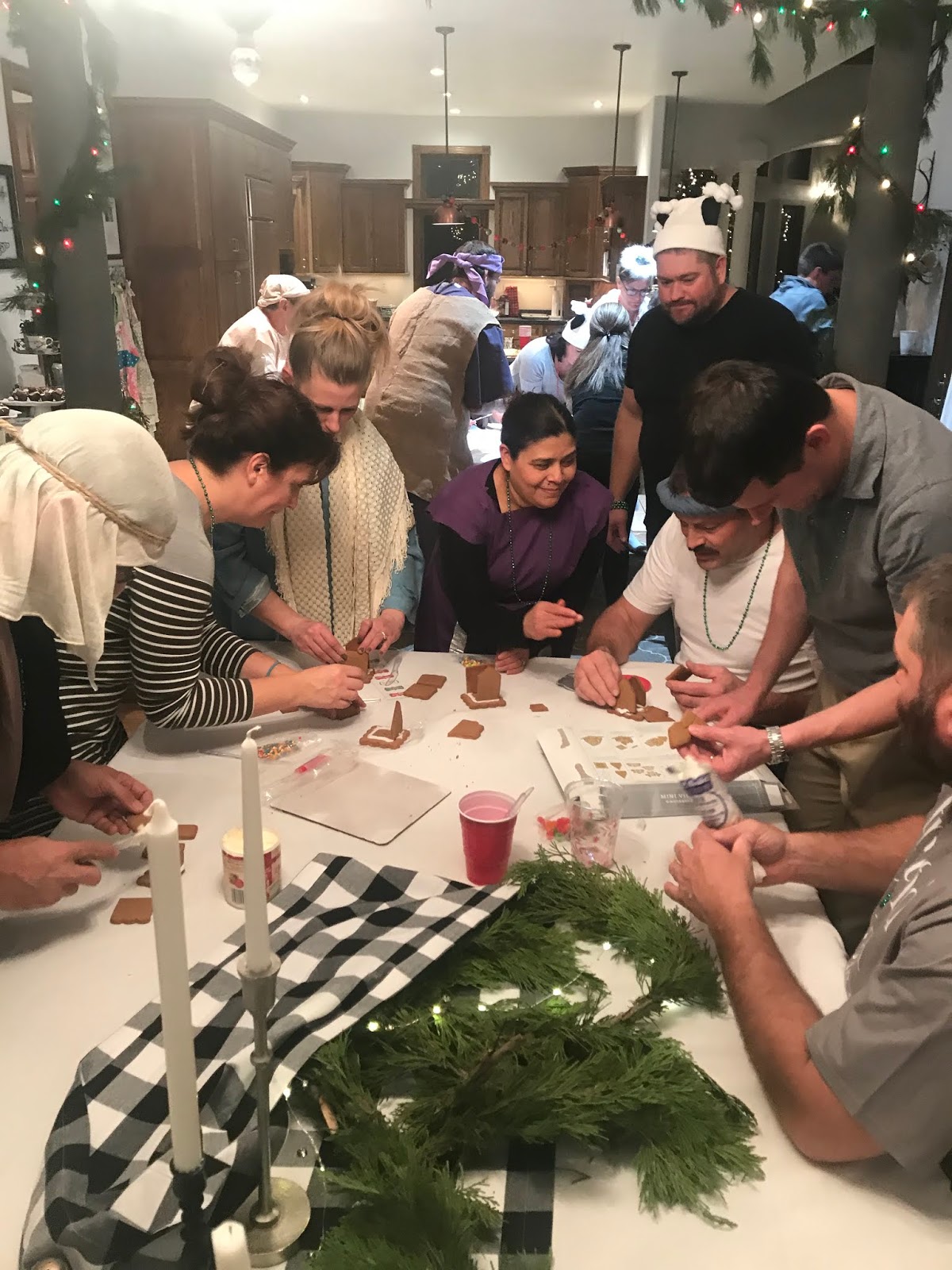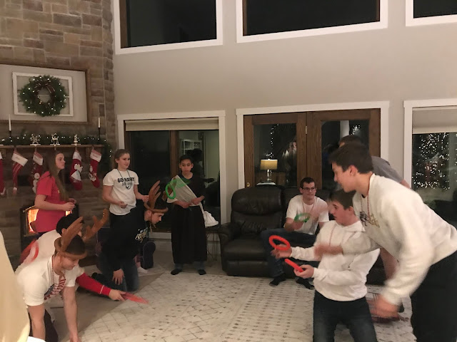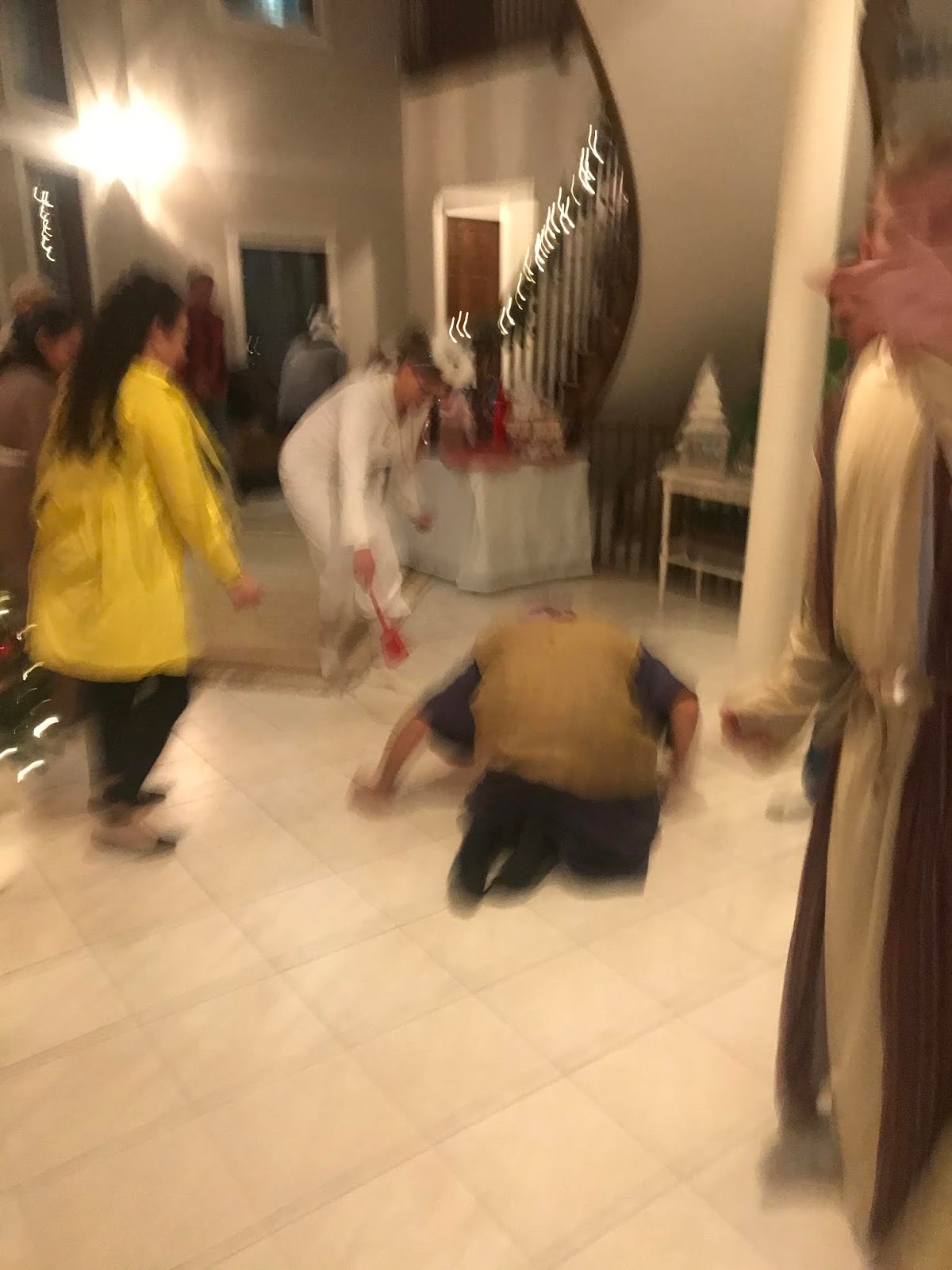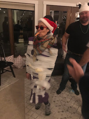 Party #2 with the “younger” people. Apparently three of them missed the memo to wear white. Wise Man Carson with his golden potato, frankincense oil, and picture of Mur{ray} was probably the favorite. Although Jack as baby Jesus and Clint as a manger were a close second. Actually, everyone did great with their costumes!