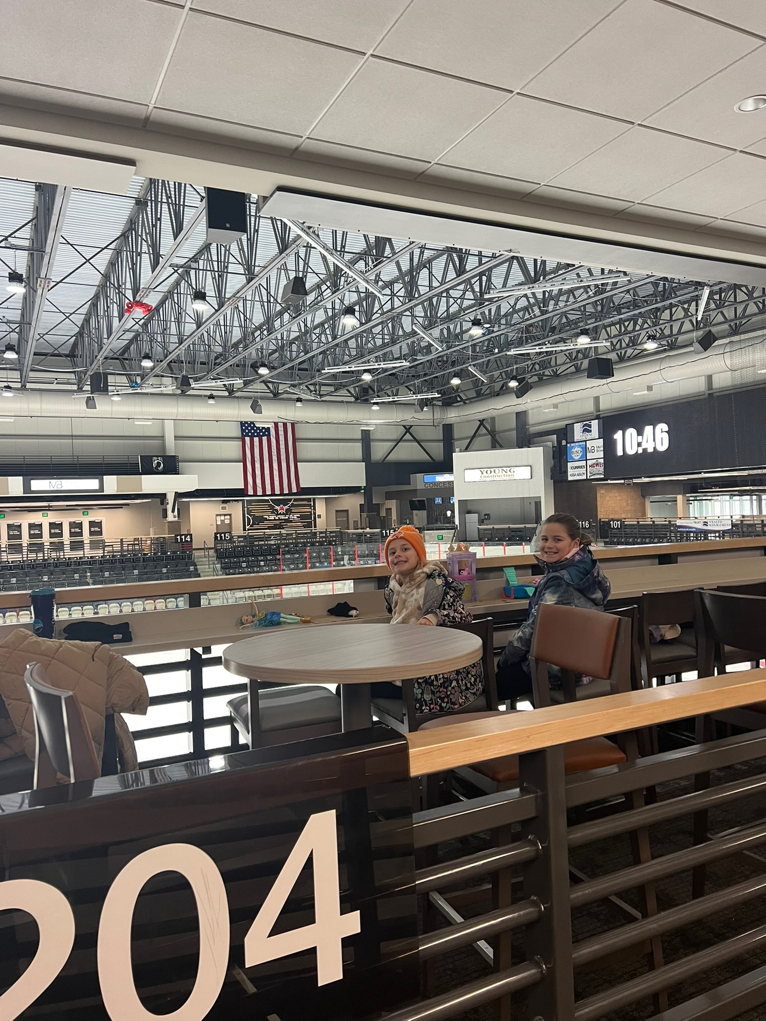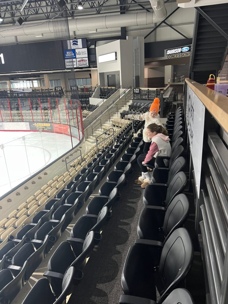 Grace and Tess would skate while the hockey players rested. And then while hockey was going on they played in the suites and tested out chairs, which is apparently just as much fun as skating.