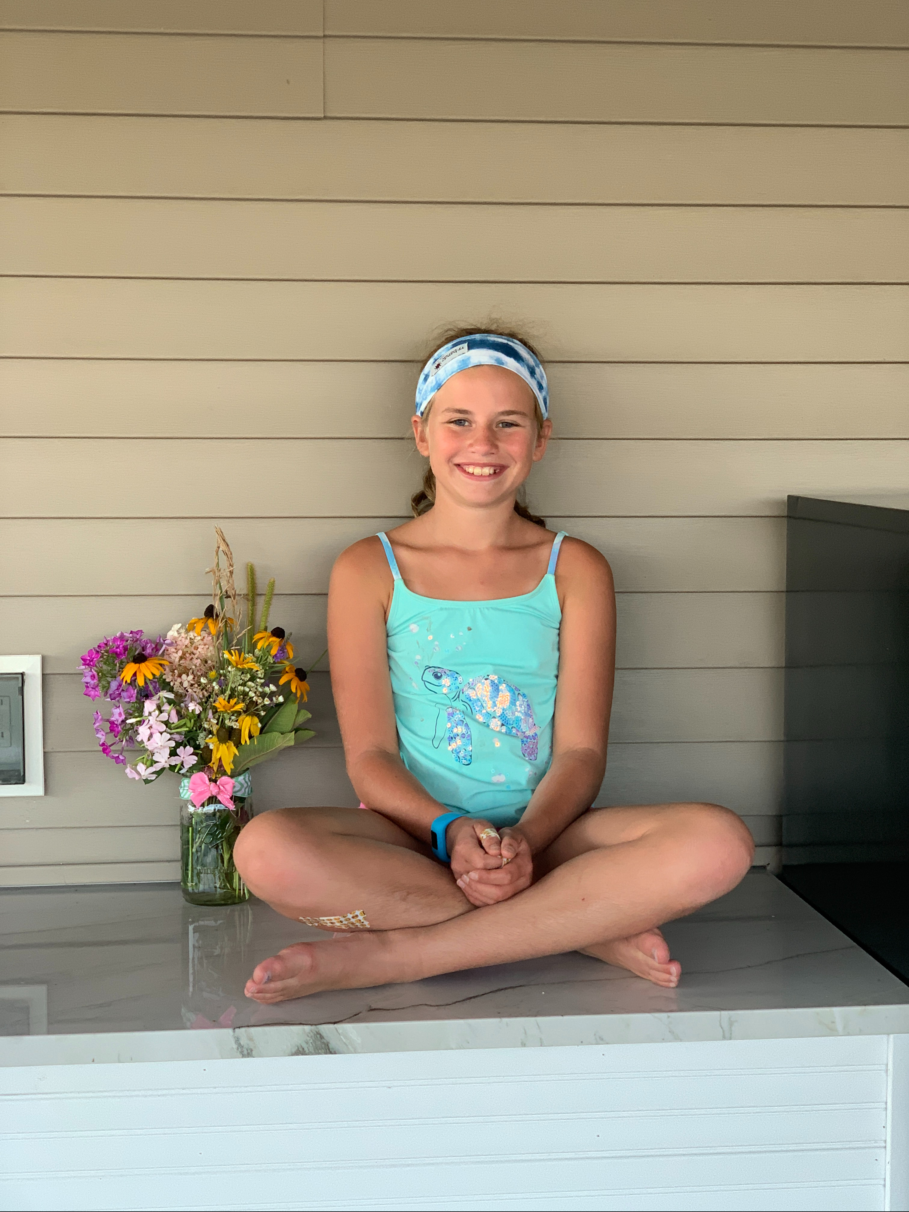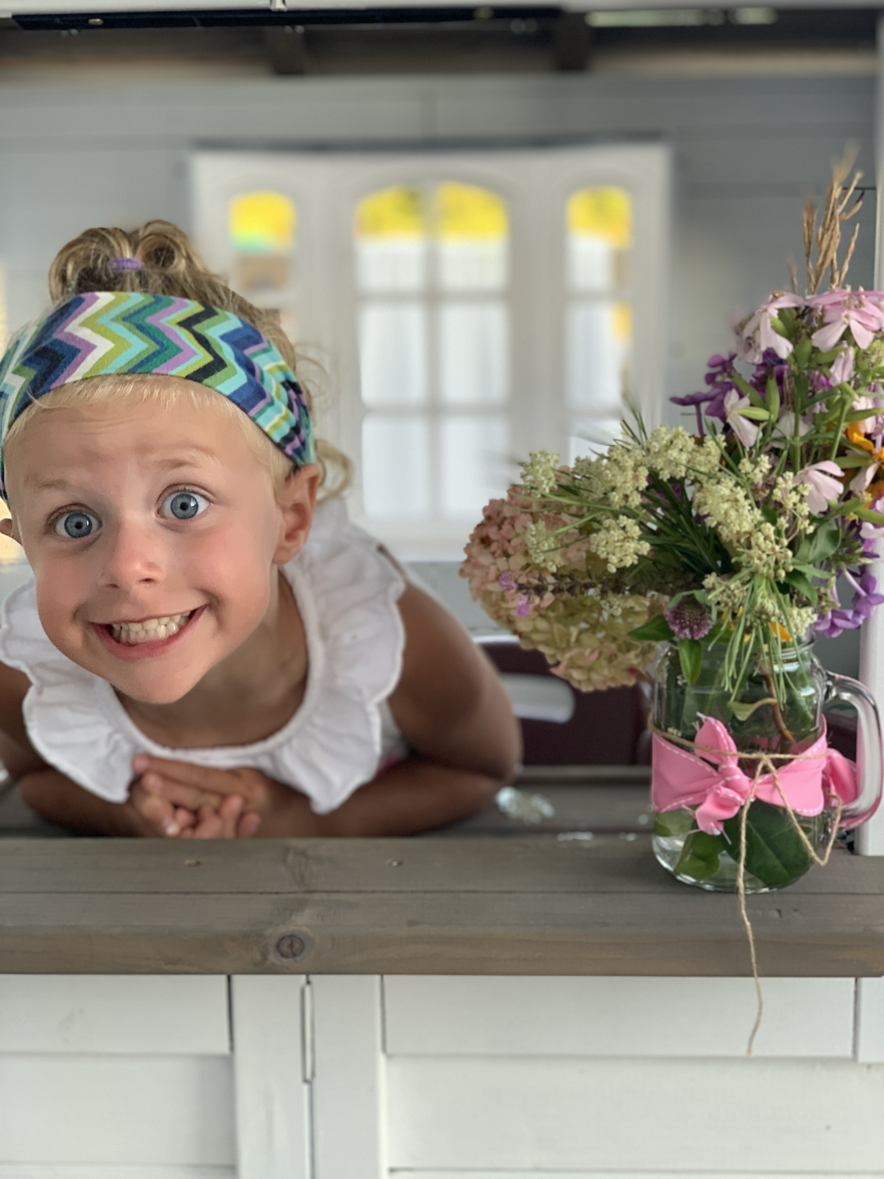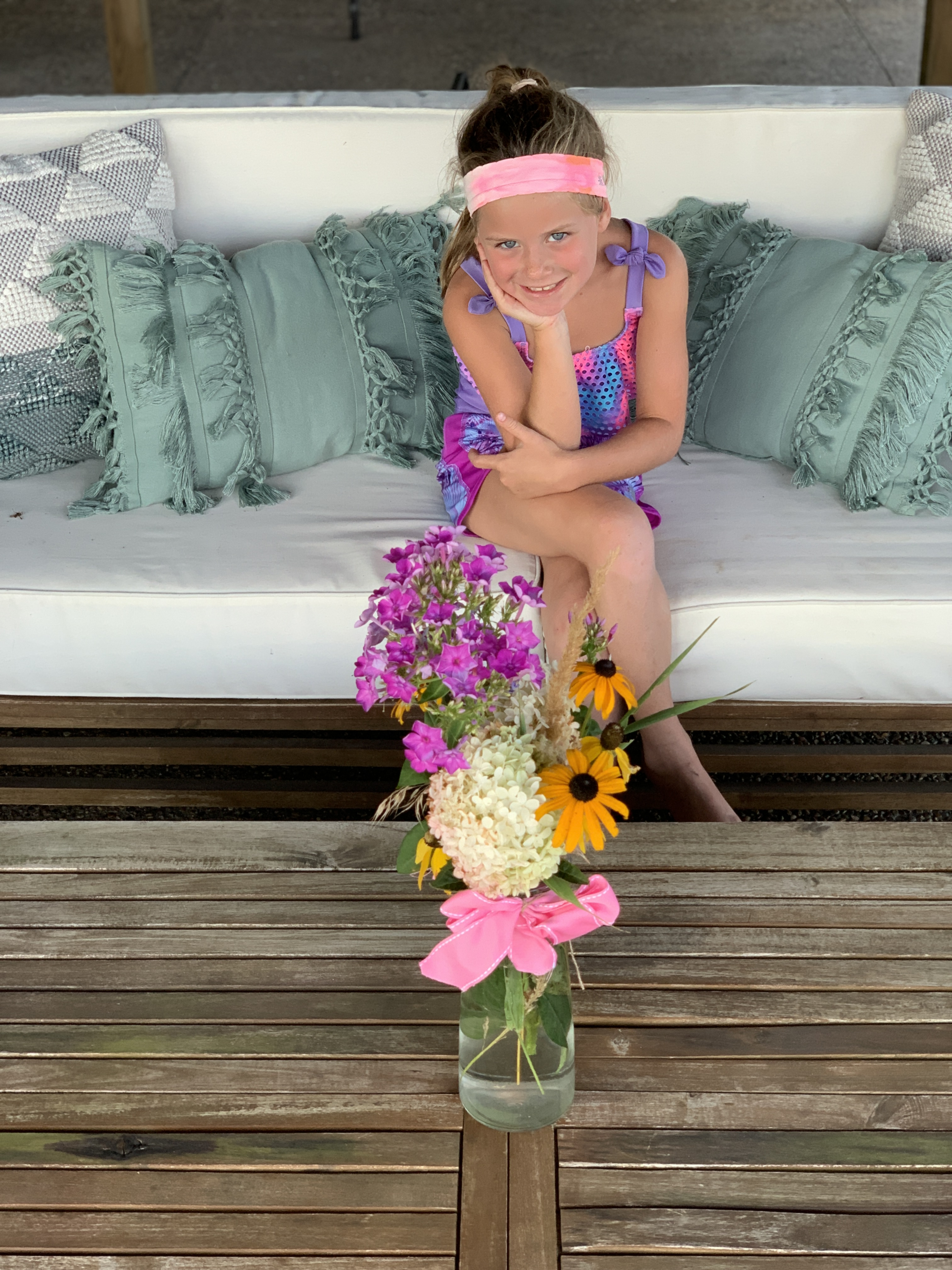 They chose a few more flowers from our pool area, and then created their own arrangement and chose a spot to place it. And of course wanted a picture with it.