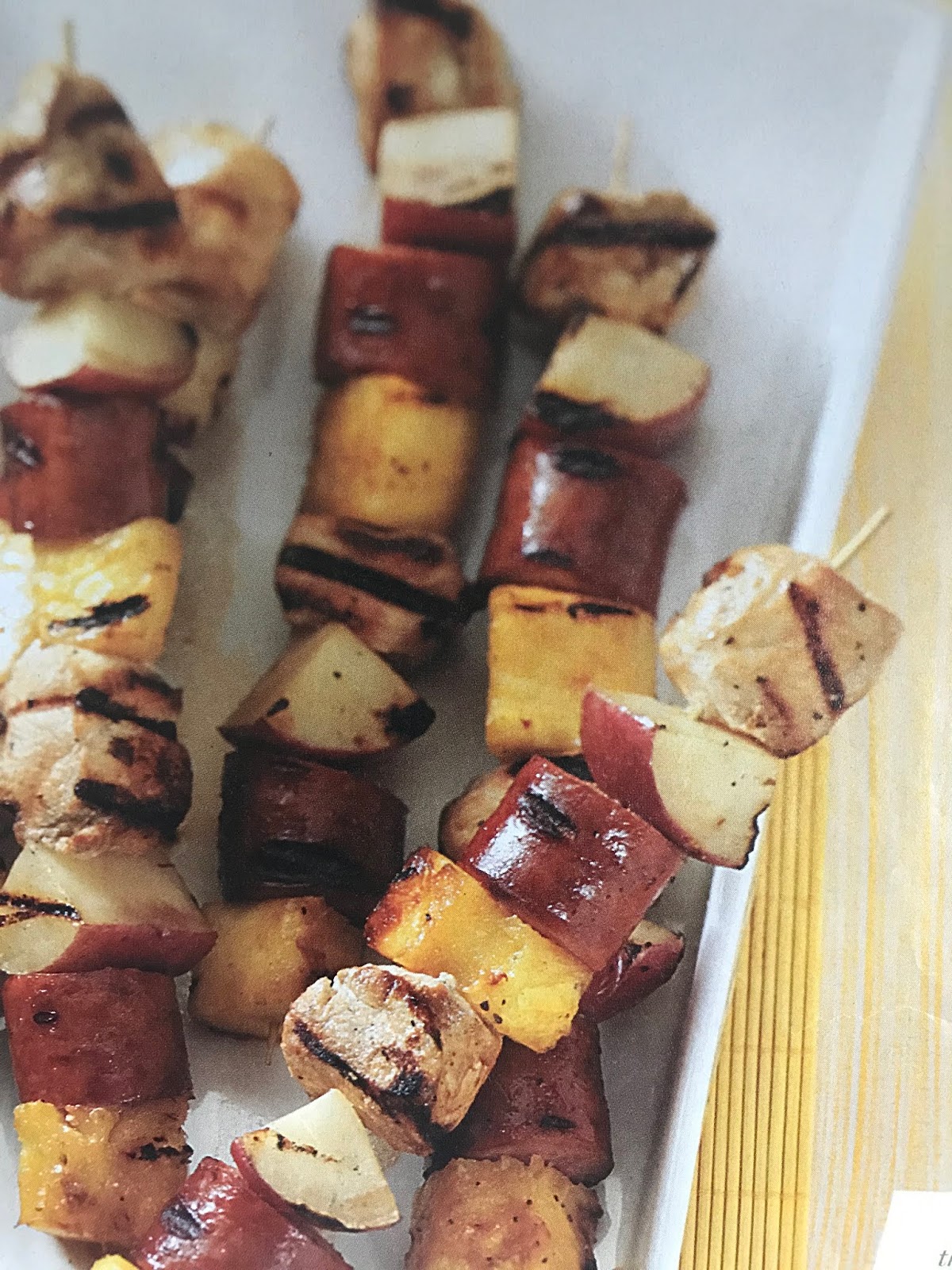 Drain and discard marinade. On metal or soaked wooden skewers, alternately thread the chicken, potatoes, pineapple, and sausage. Grill, covered, over medium heat for 10-15 minutes or until chicken juices run clear, turning frequently.