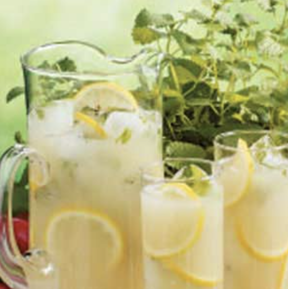 2 1/4 cups water, 1/2 cup coarsely chopped fresh mint, 1/2 cup lemon juice, 2 sliced lemons, 1/2 cup lemon sherbet, 1 liter ginger ale