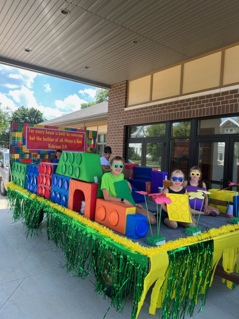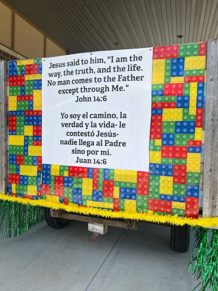 We assemble the float at our church, and then have to make the nerve-wracking 5 minute drive over to where the floats line up. We’re never really sure if everything will remain in place during that drive or if we’re going to show up with a float that looks like it’s been through a war. Thankfully, this one held together pretty well! Which is good, because our theme wouldn’t have been quite as effective with a float that looked like it was falling apart.