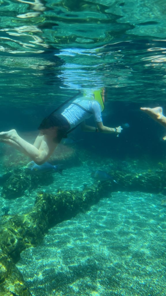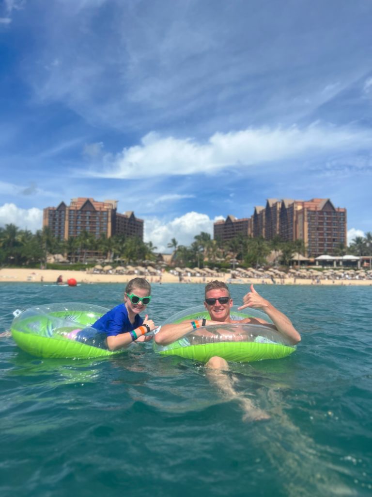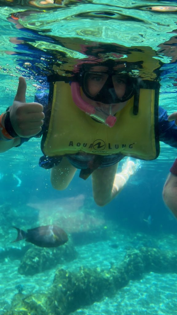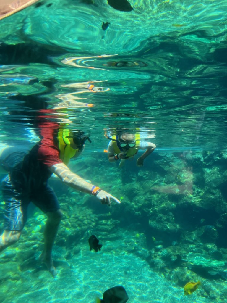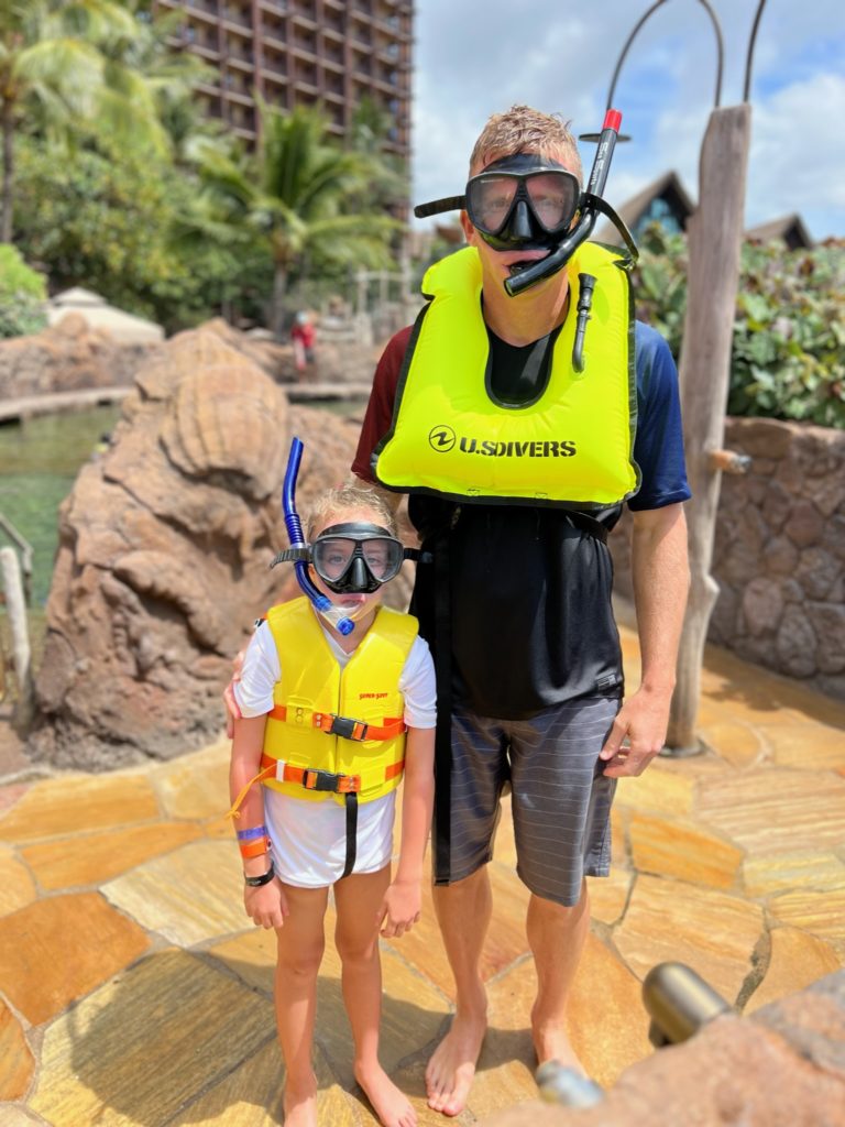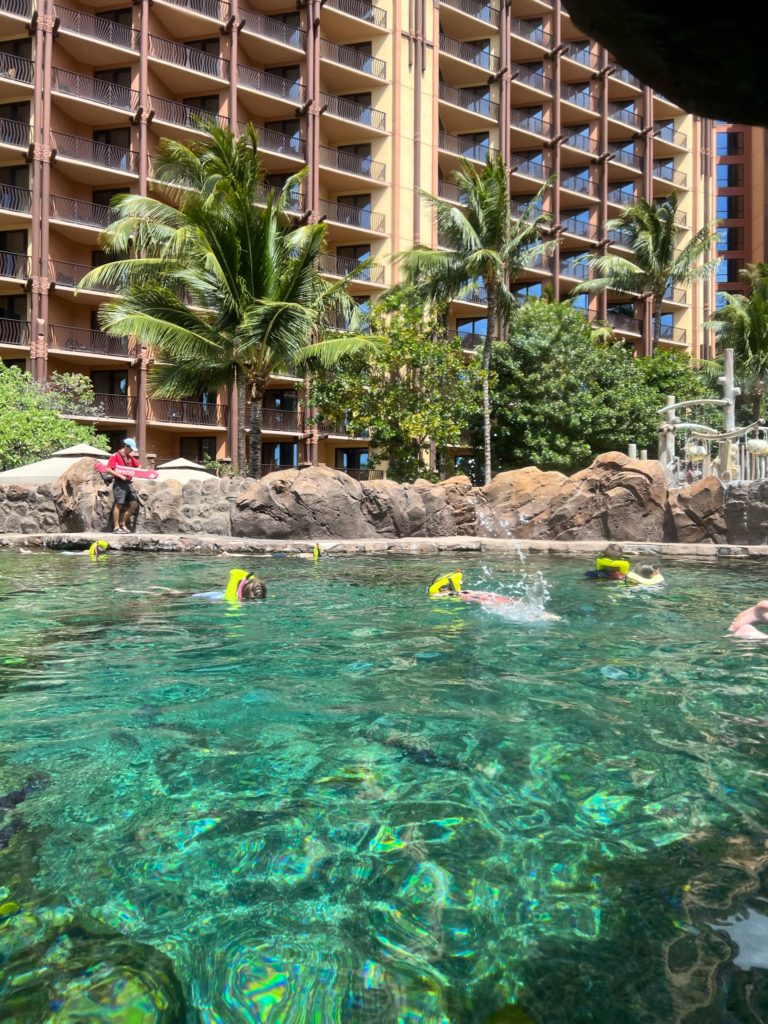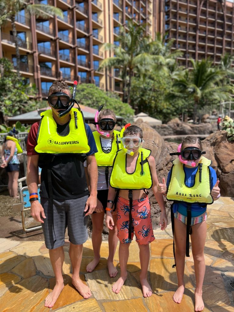 Aulani has a snorkeling reef in the middle of the resort. It’s chilly water, just like the ocean, but without the fear of being in waves or the big ocean or an unexpected eel coming at you. In other words, a perfect snorkeling situation in my books. 😏 3 out of 4 kids LOVED snorkeling. Claire liked seeing the fish, but didn’t love the idea of fish touching her.