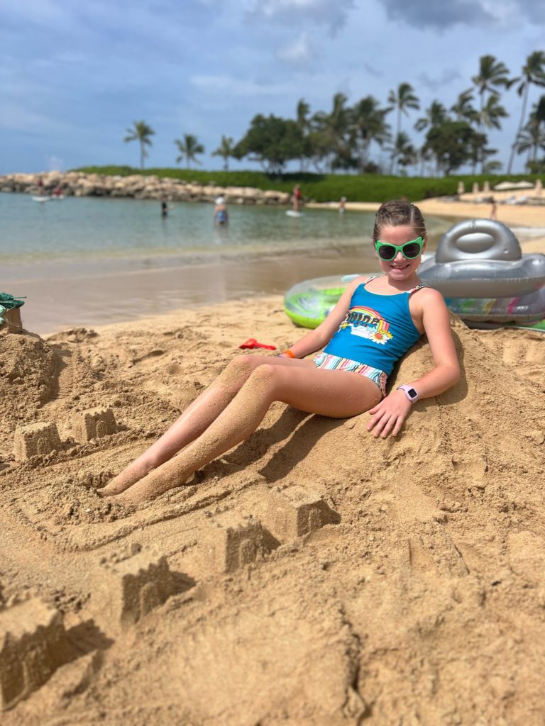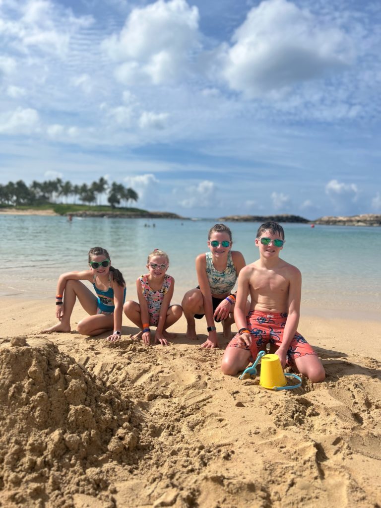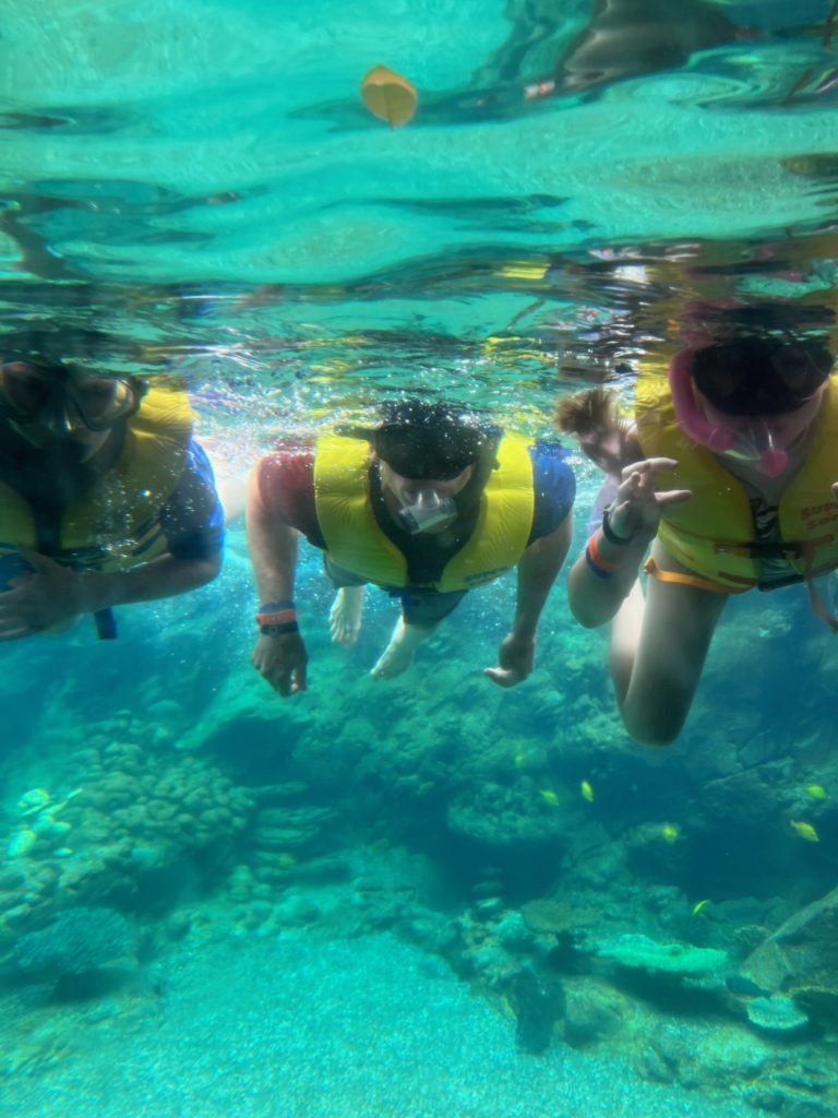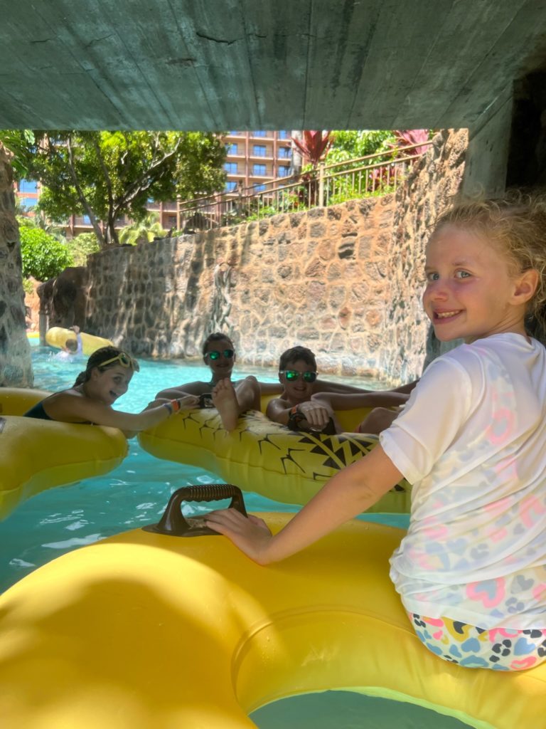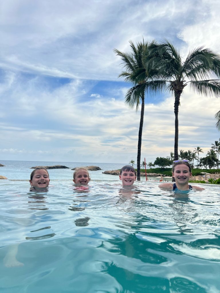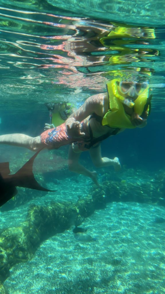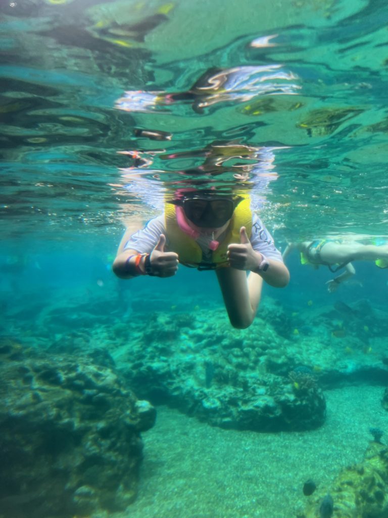 Aulani has a snorkeling reef in the middle of the resort. It’s chilly water, just like the ocean, but without the fear of being in waves or the big ocean or an unexpected eel coming at you. In other words, a perfect snorkeling situation in my books. 😏 3 out of 4 kids LOVED snorkeling. Claire liked seeing the fish, but didn’t love the idea of fish touching her.