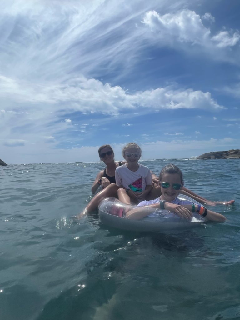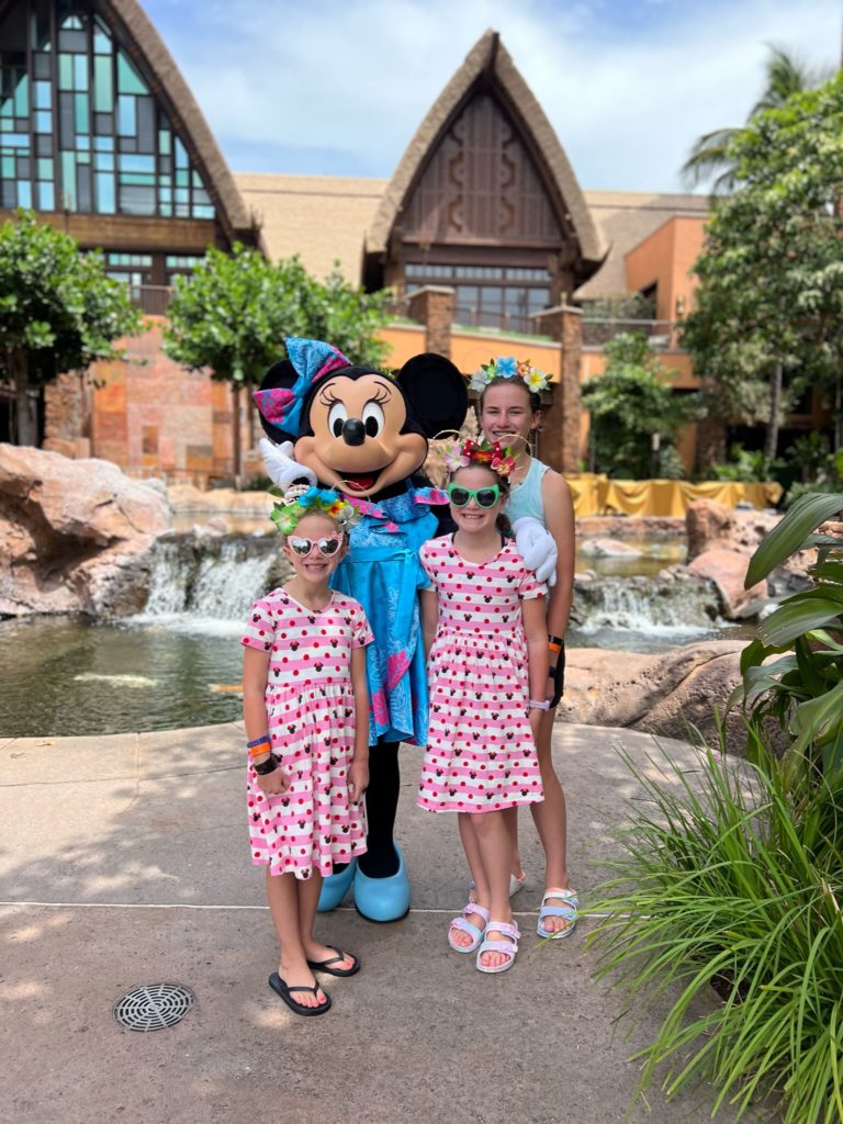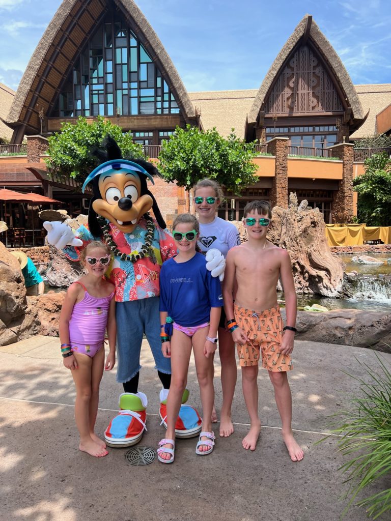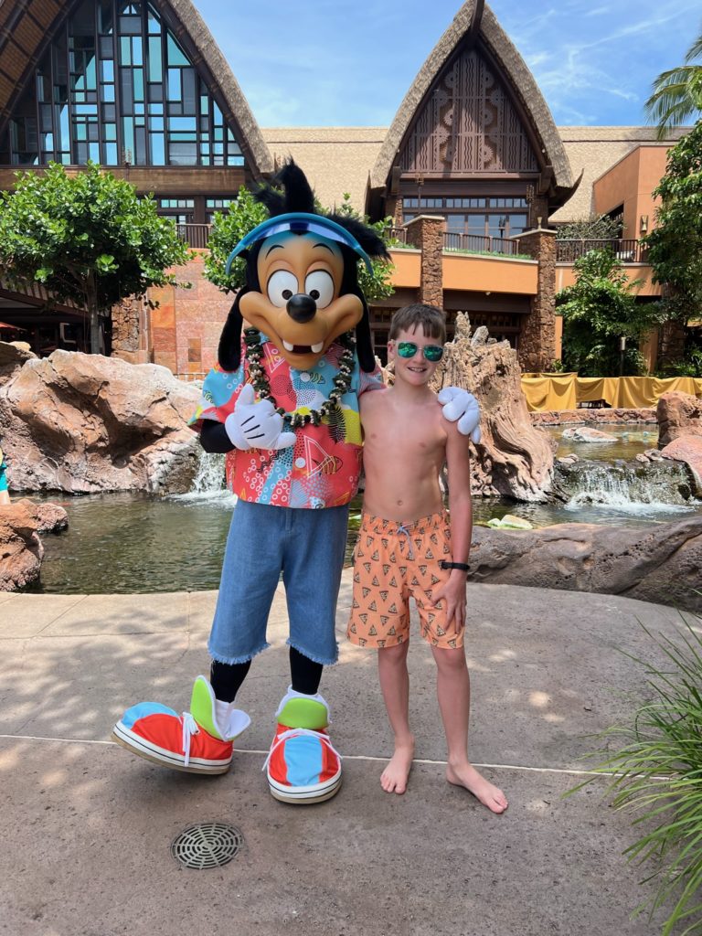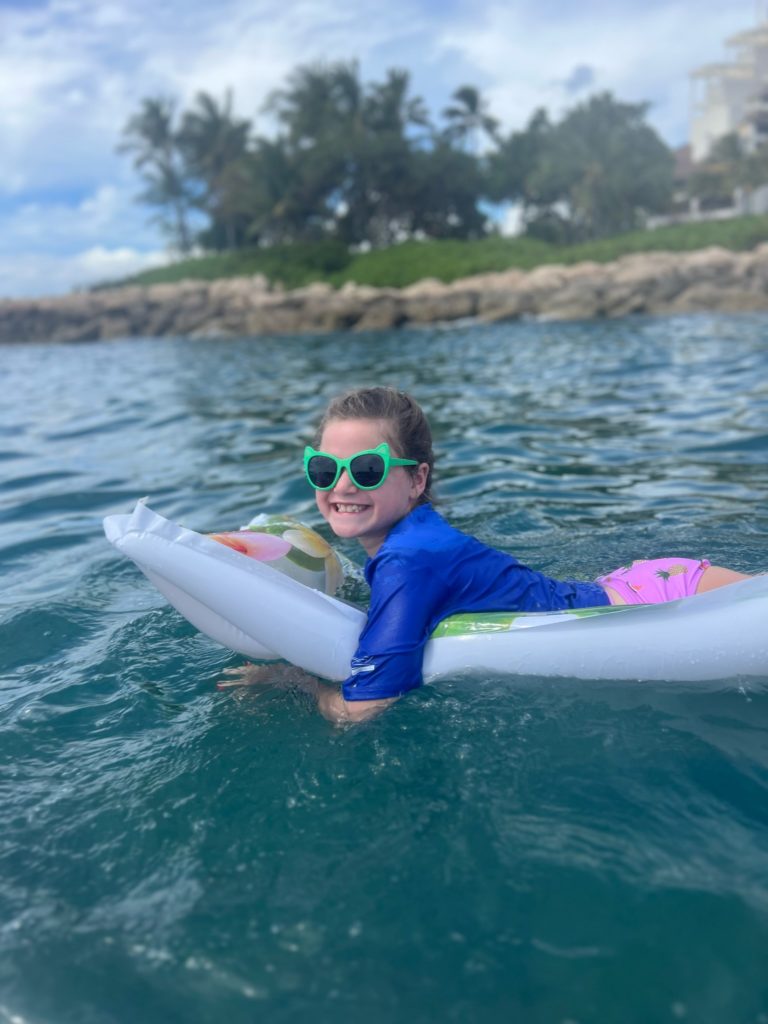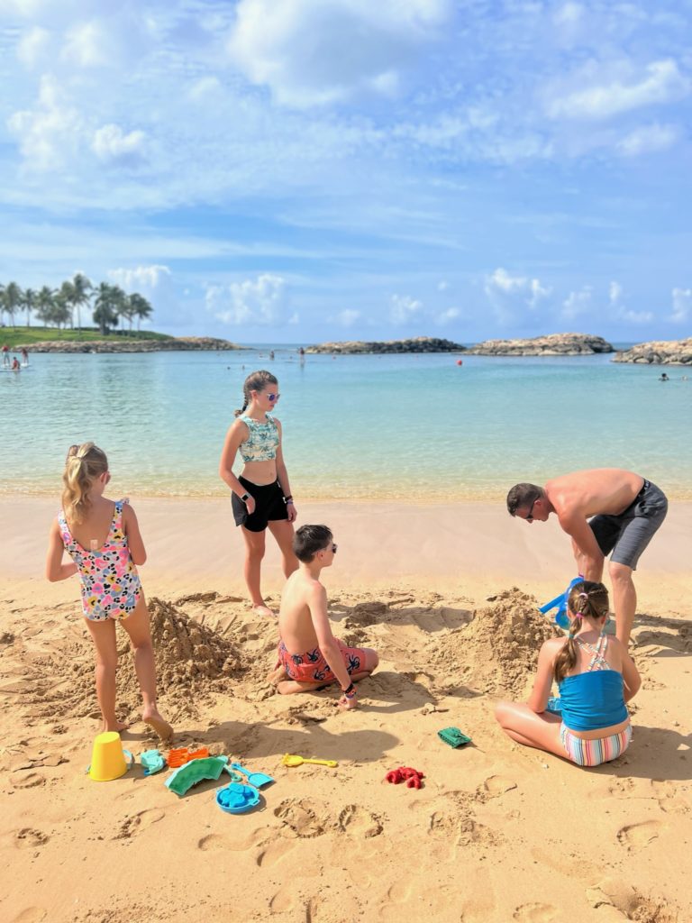 Aulani has a snorkeling reef in the middle of the resort. It’s chilly water, just like the ocean, but without the fear of being in waves or the big ocean or an unexpected eel coming at you. In other words, a perfect snorkeling situation in my books. 😏 3 out of 4 kids LOVED snorkeling. Claire liked seeing the fish, but didn’t love the idea of fish touching her.