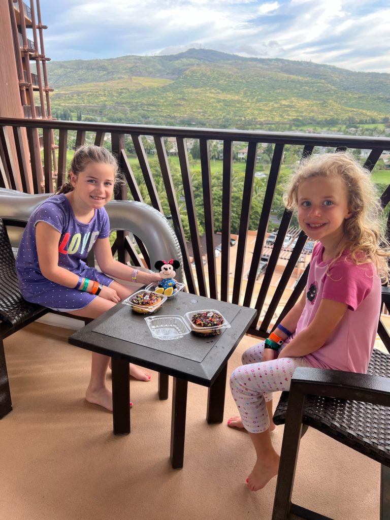 The next morning Ben and Max left early to go hiking with our friend Keith. Meanwhile, the girls and I had some Mickey donuts on the balcony.