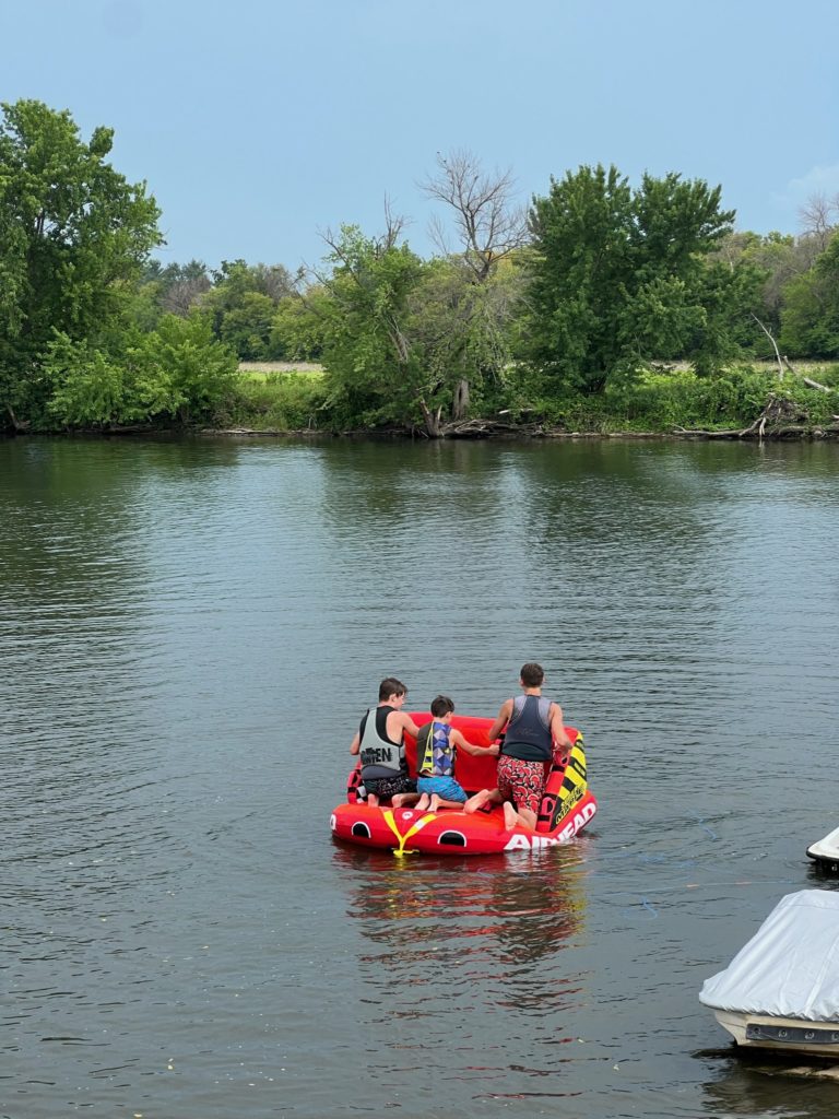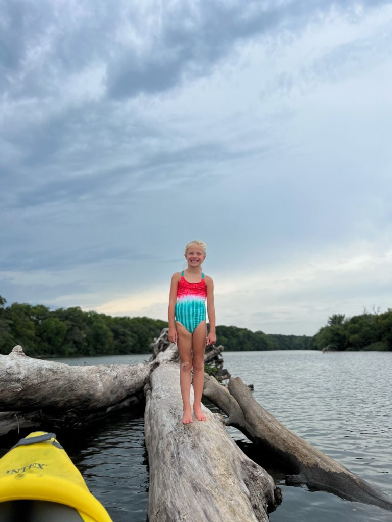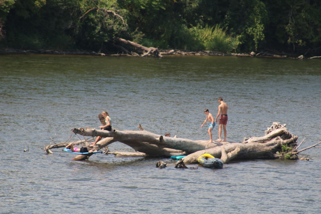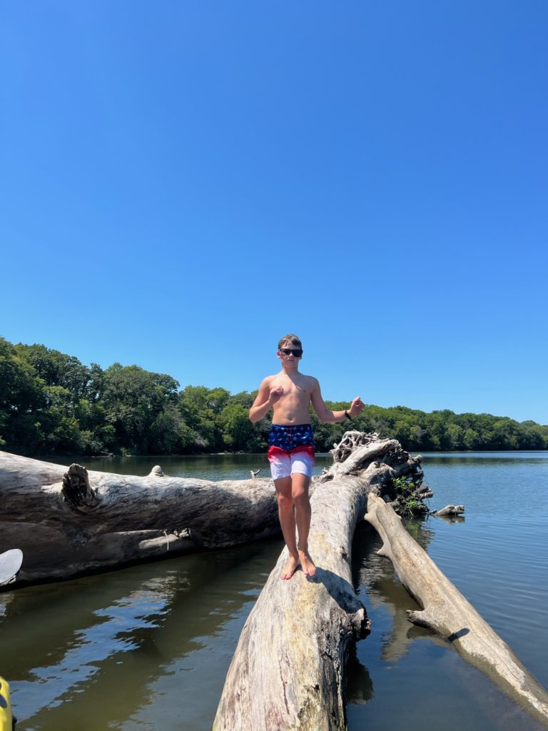 This huge log got stuck on the sandbar right in front of our house, and the kids absolutely love climbing on it. The river is shallow enough that you can walk the entire way to it from our dock (their lifejackets weren’t actually necessary…they had just finished tubing).