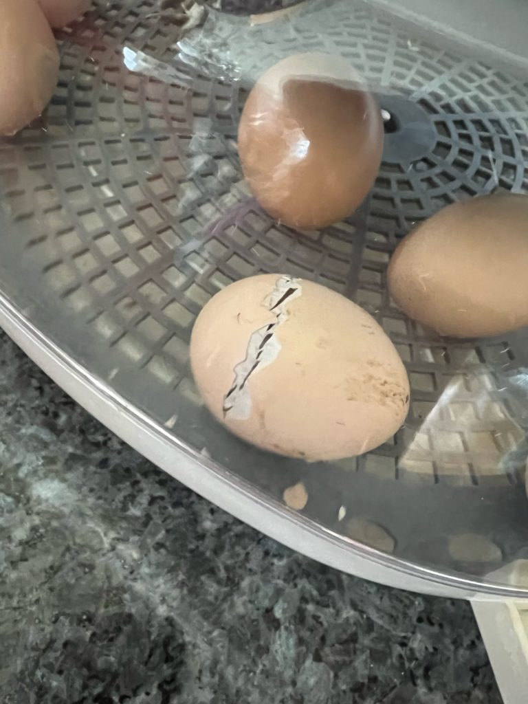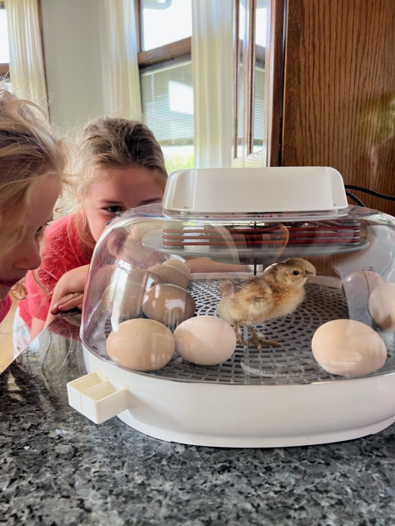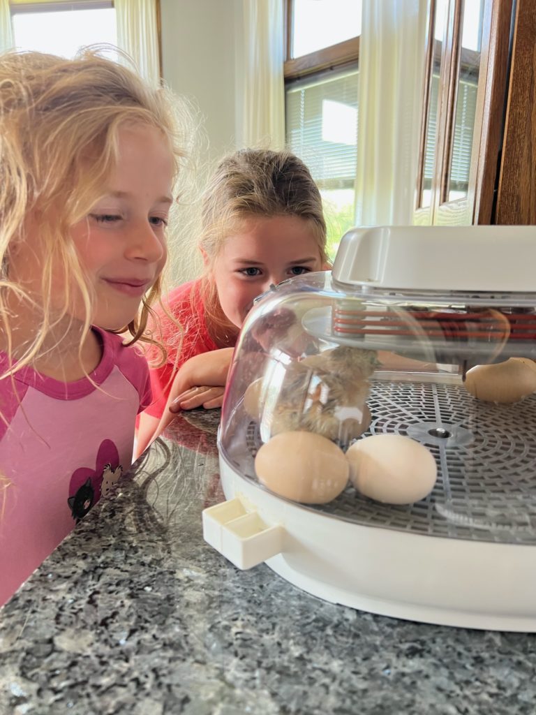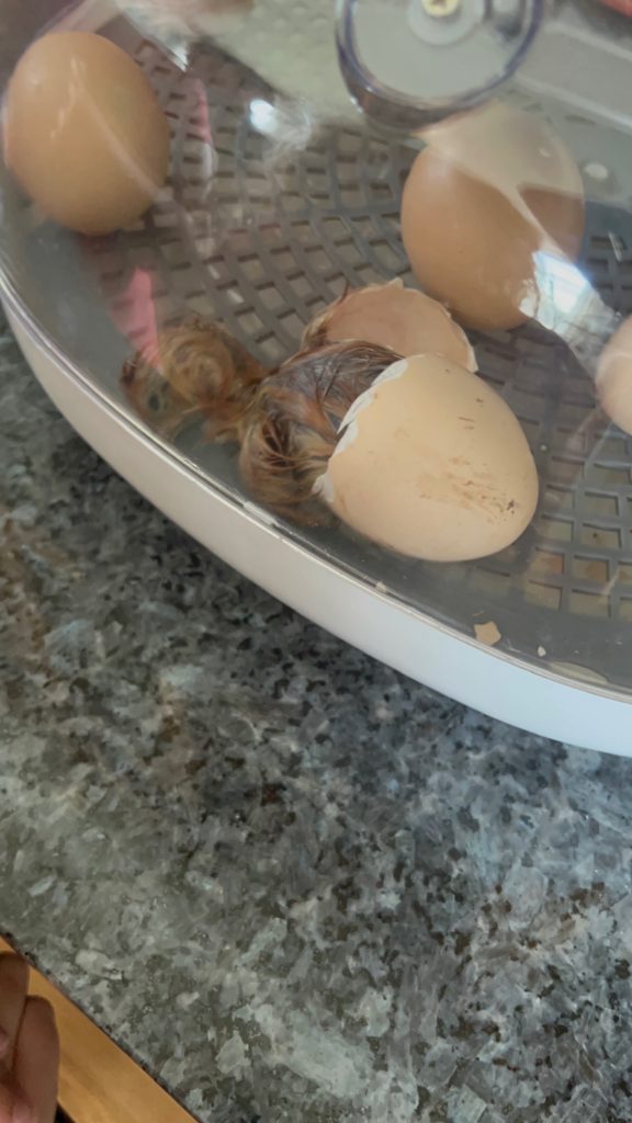 Last Sunday morning (3 days before Tessa’s party) I thought I heard a tiny chirp coming from the dining room, and to our surprise there was a chick standing up in the incubator! Another chick was busy pecking her way out of an egg, so we were able to witness it.