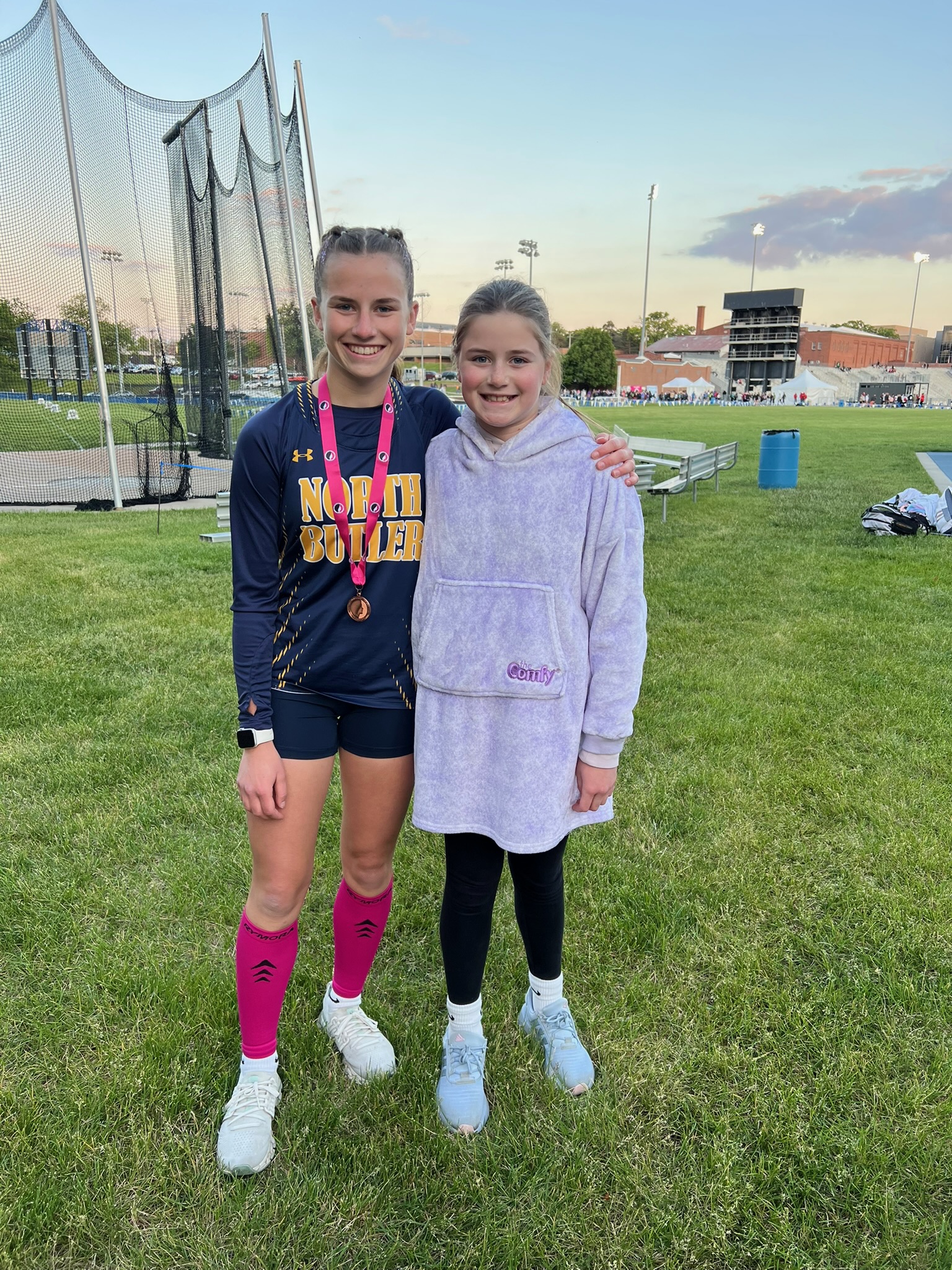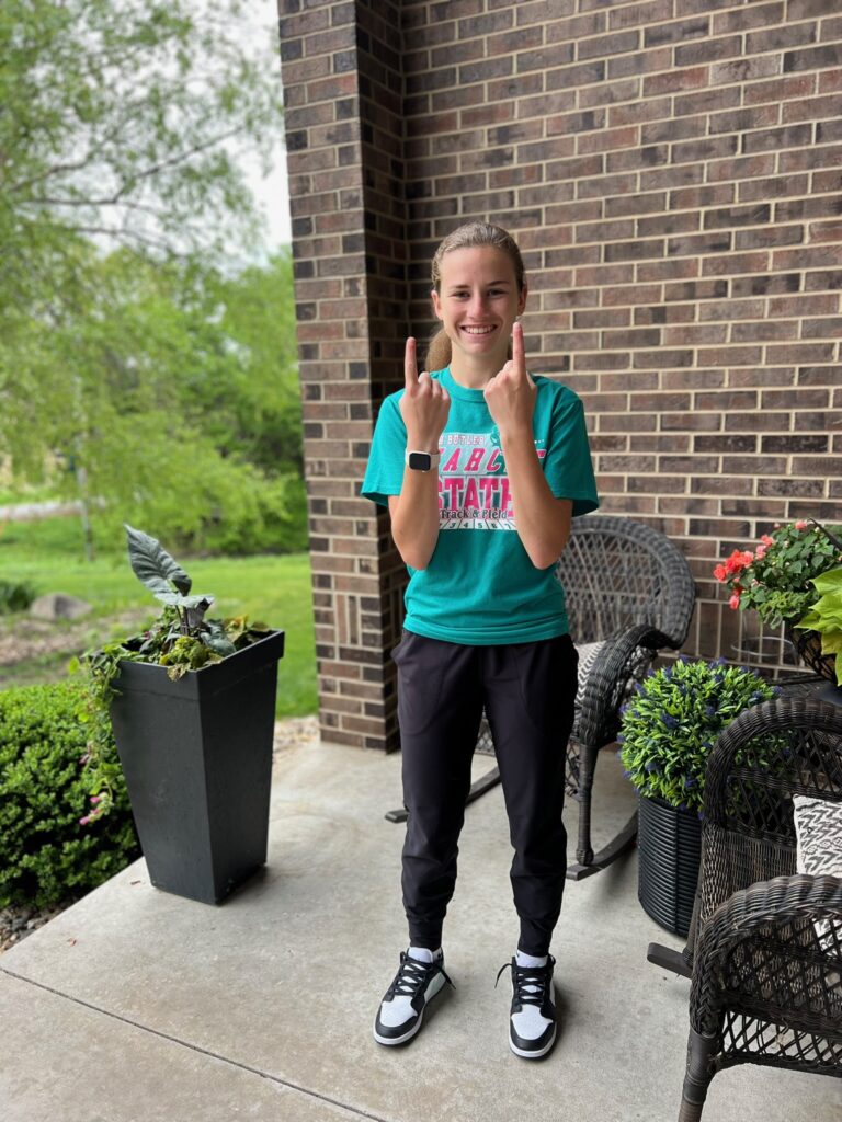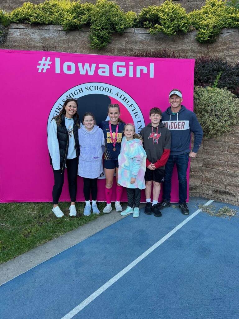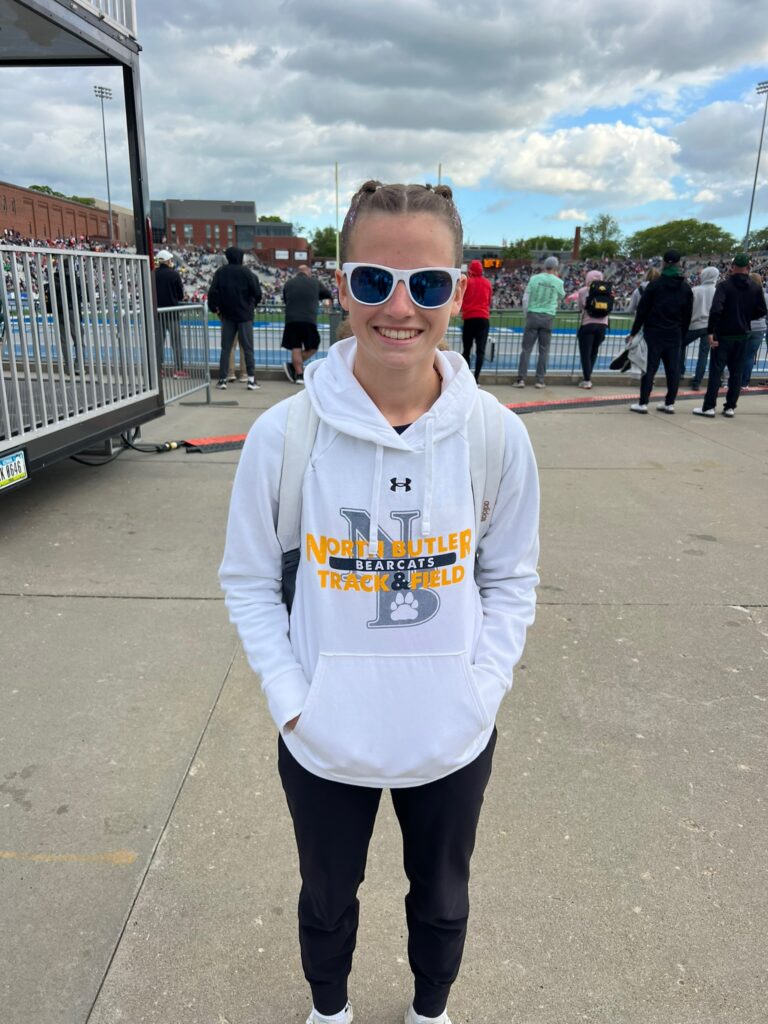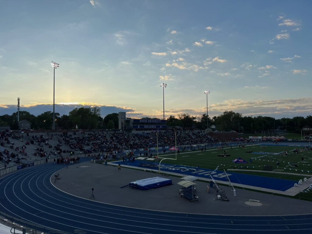 As I mentioned before, Claire’s shuttle hurdle team made it to state. Â And state happened to start on our last day of school. Â She and her teammates got out at 10 that day, and then headed to Des Moines with their coach. Â I picked up the girls from school and then we all made our way down there to cheer her on.