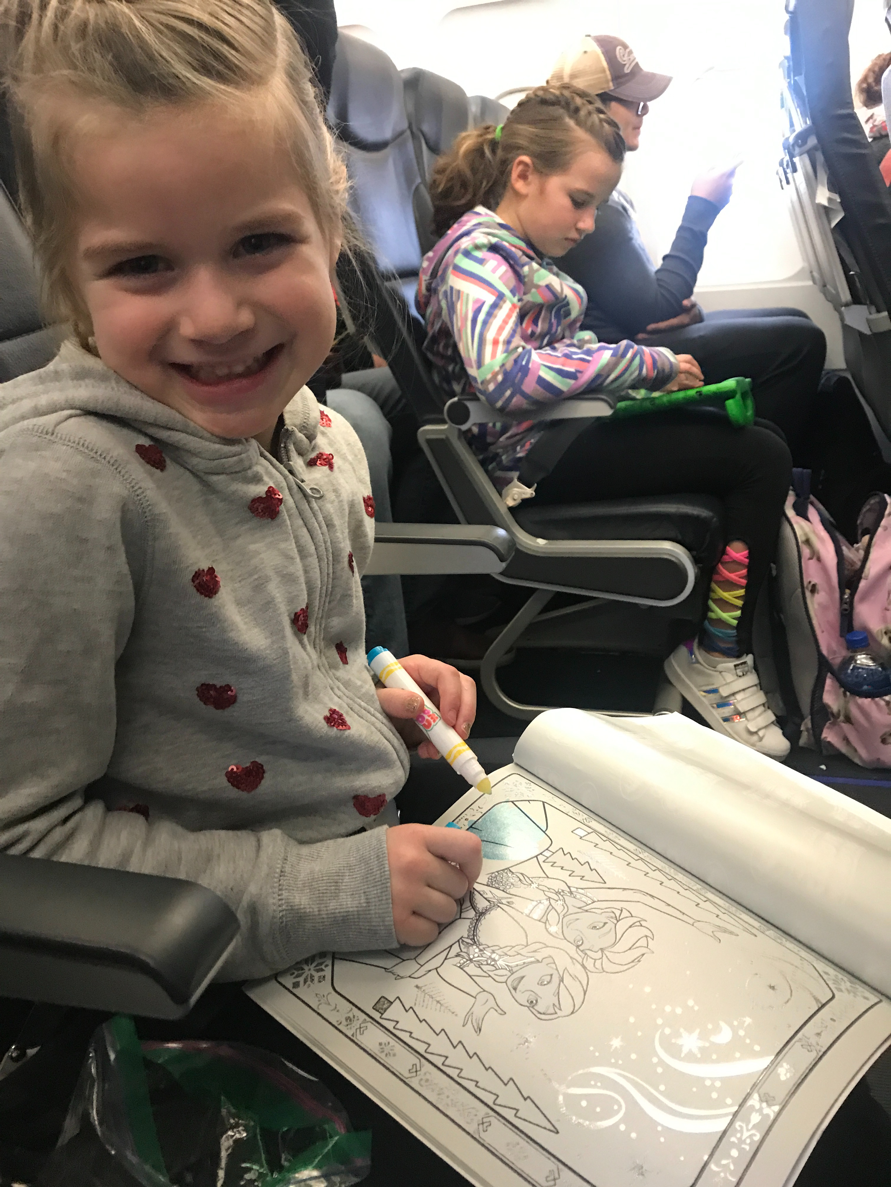 The kids each carry on a little backpack with their iPad, headphones, small pillow, snacks, books, and a few little activities. To help with ear pain, I pack little lollipops for them to suck on- it works like a charm.