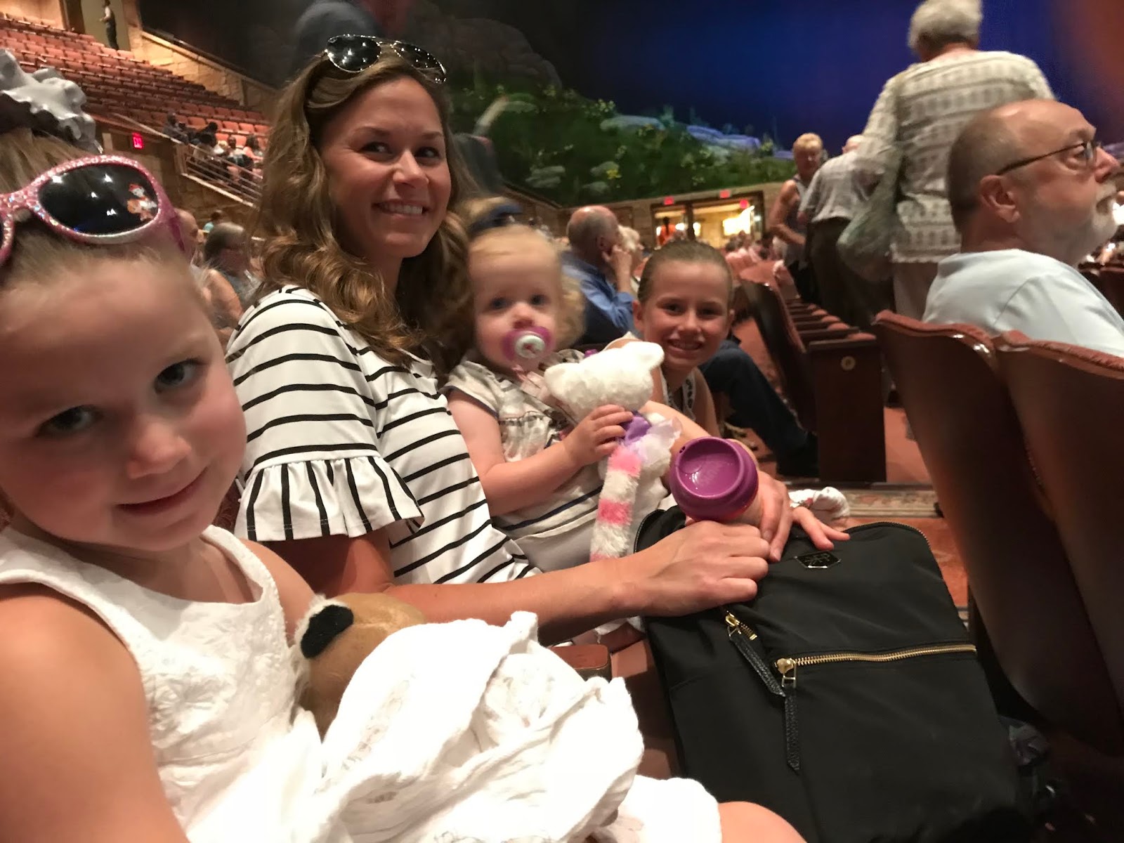 It was 2 1/2 hours long with a 20 minute intermission…and these kids did spectacular. Grace got a little nervous during the storms, and Tessa would occasionally say “all done”, but overall they were wonderful! The stage is so bright and busy, and live animals were walking right next to us, so there was a lot for their little eyes to look at.