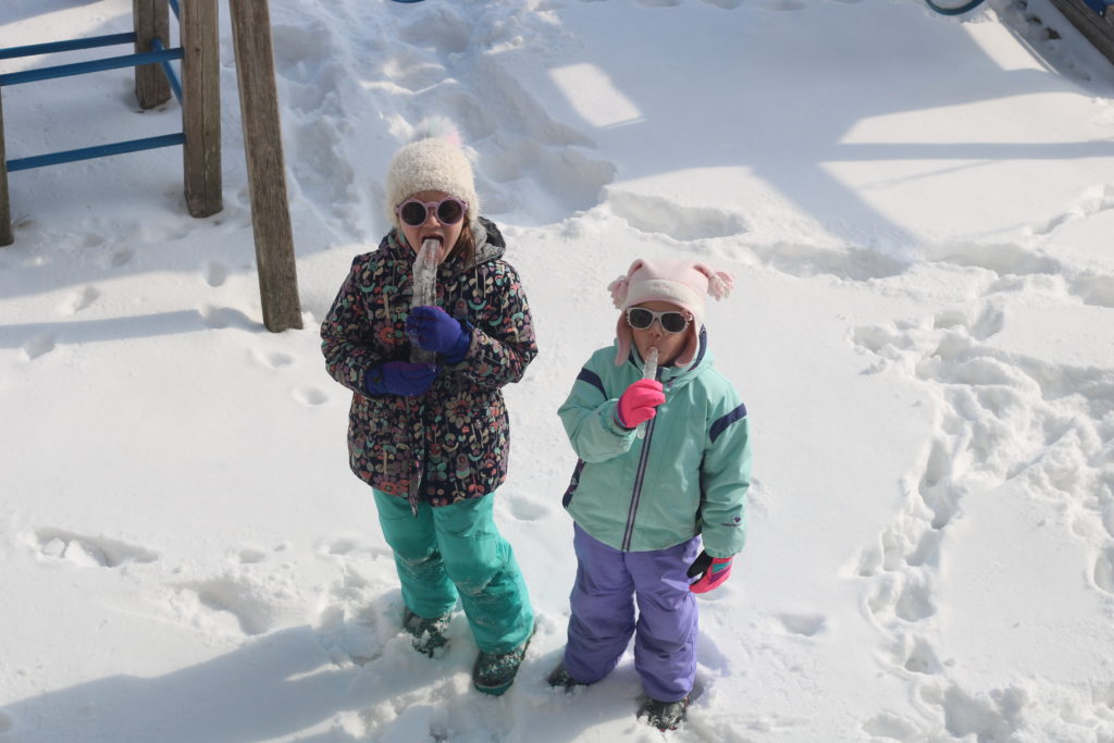 Meanwhile, these two explored the backyard while eating icicles.