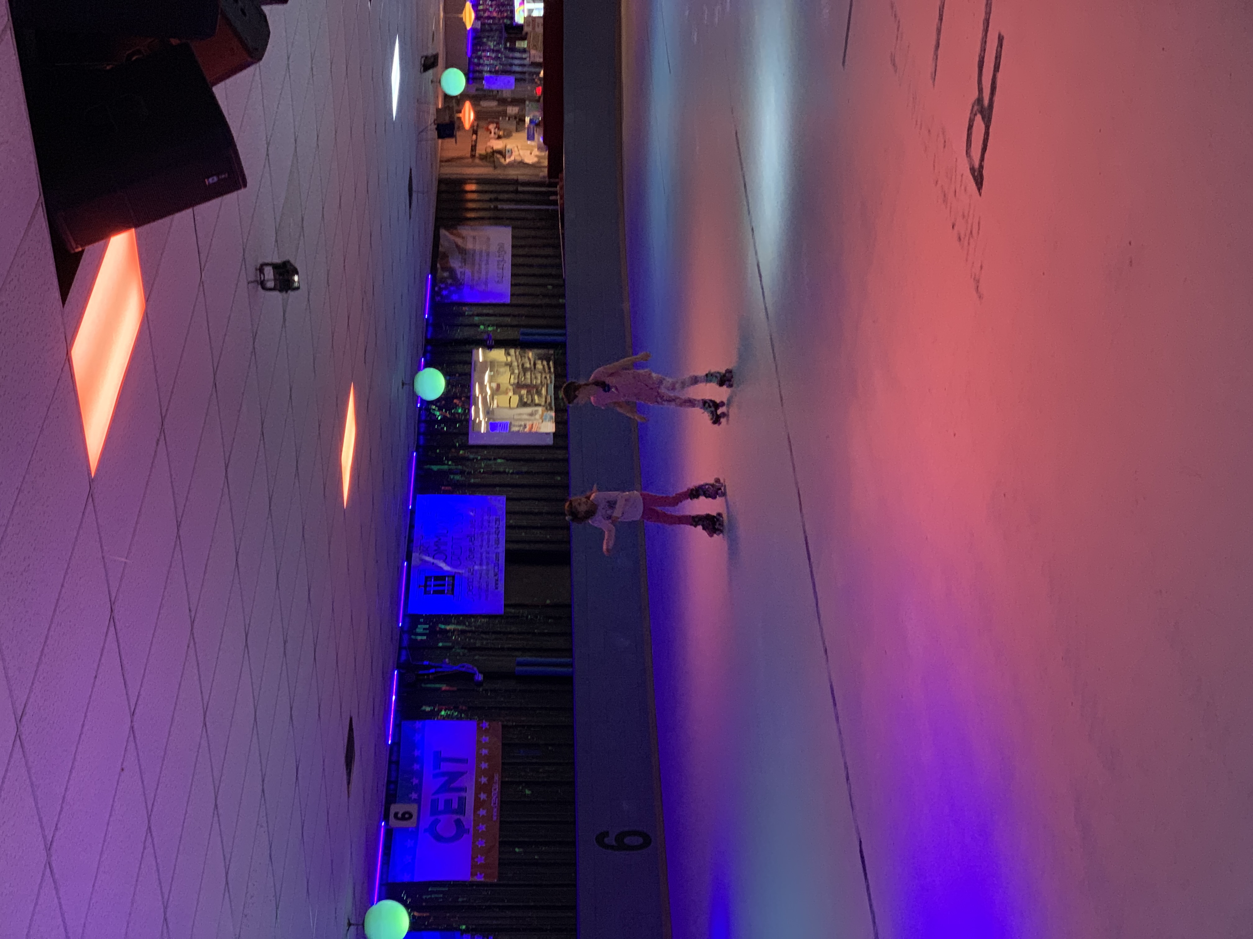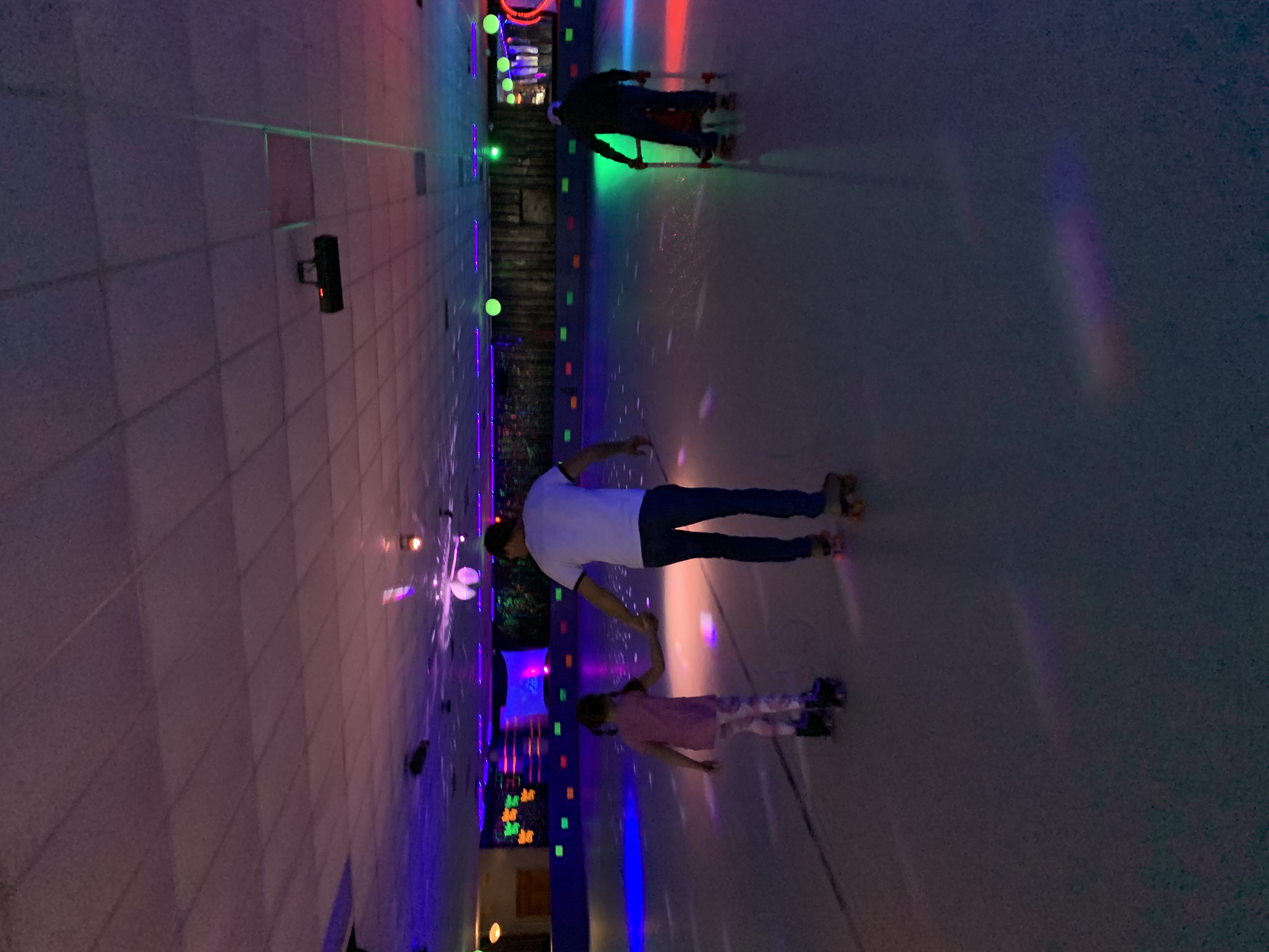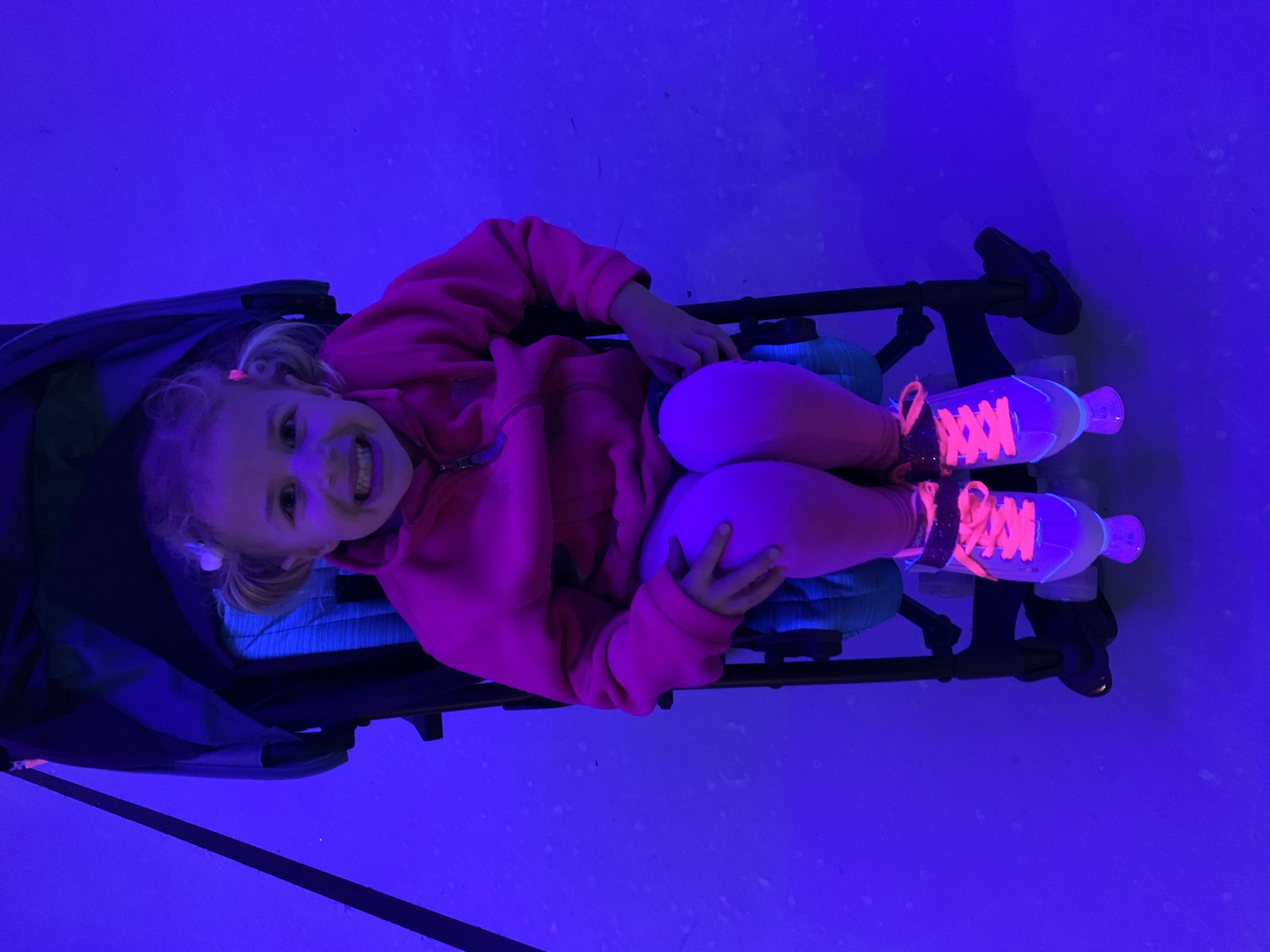 Tessa wanted to skate so badly, but she has to be reallllllyyyyyy careful not to fall on her malformations (aka, her backside). So, she wore her skates while I pushed her around in the stroller. And she loved it- especially when the black lights made her skates glow.