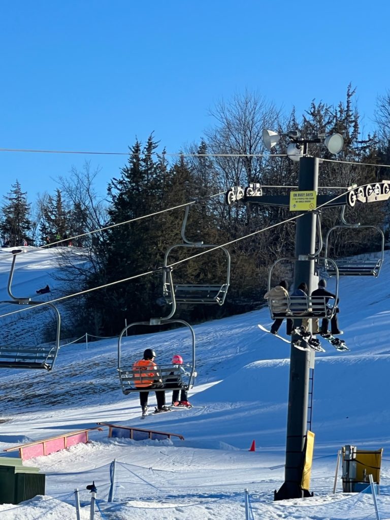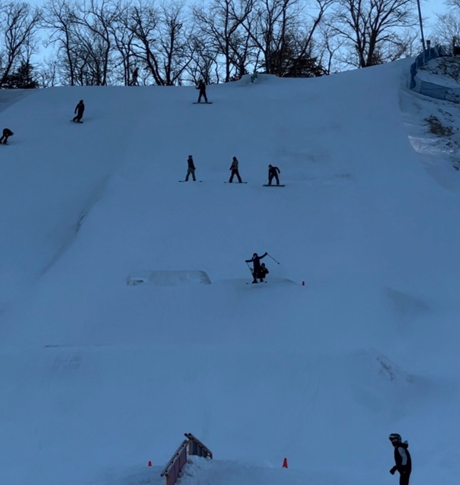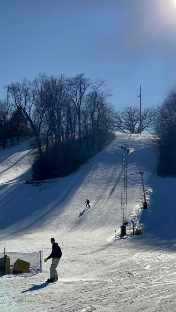 My ankle prevented me from joining in the festivities, but sitting by this lovely heater and watching everyone come down was pretty nice! When Tess was done, she enjoyed some snacks and played in the snow while the others did more runs.