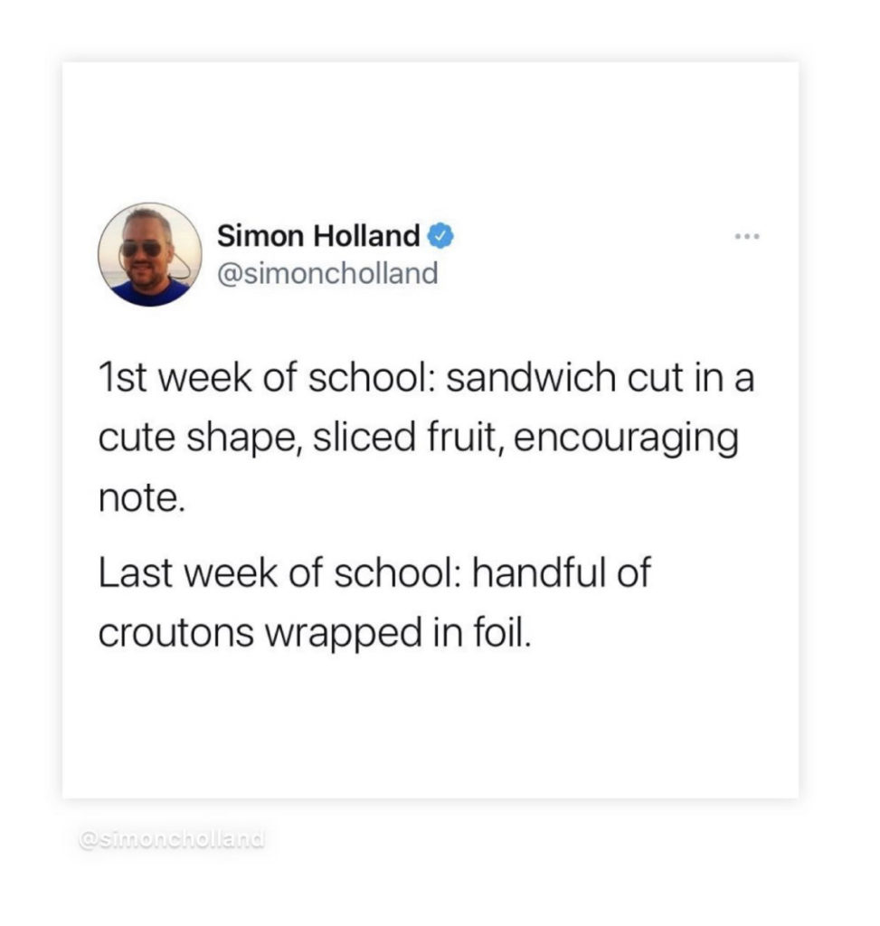 Having a break from packing lunches. Downside: they’ll be asking for food approximately 985 times each day.